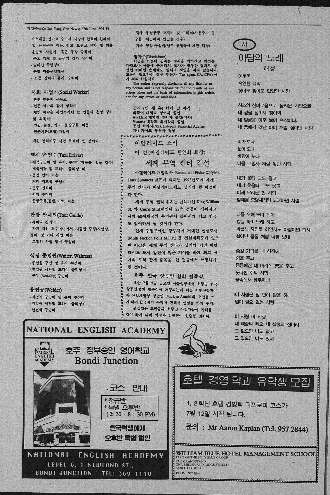 이민자들이 알아야 할 법률과 정보 외에, 이민자 당사자들의 글, 관련 소재 중심 기사, 이민자 사업장 광고, 호주 이민 법과 정책, 한국의 주요 정치 기사, 국제 정세 기사 등이 소개되어, 호주에 사는 이민자들이 한국어로 사회문제를 알 수 있는 기회를 제공했다.
