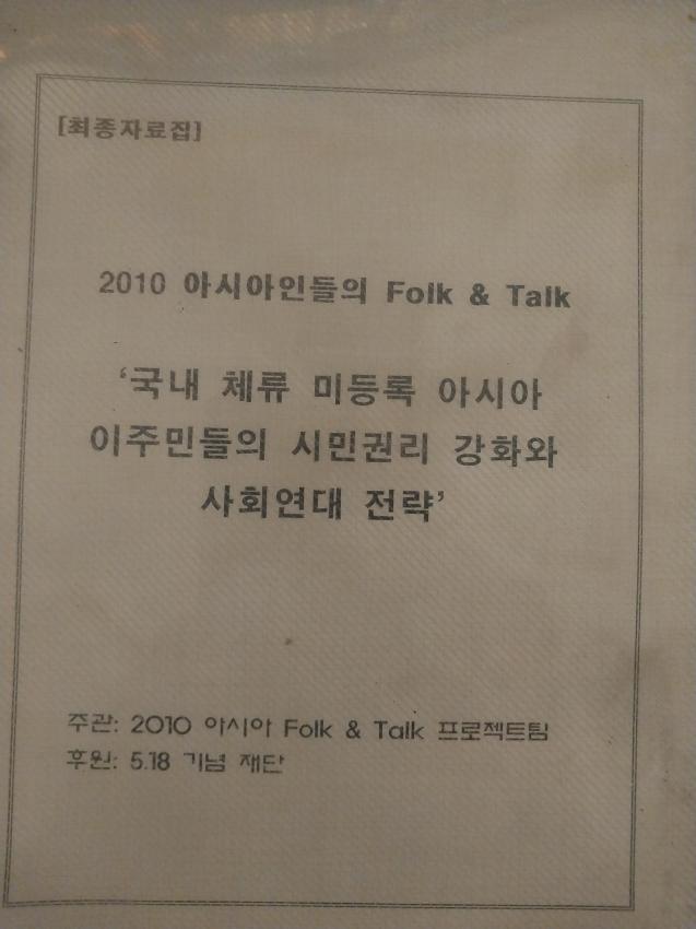 2010년 사회운동 단체에서 이주와 여성문제에 관심있는 활동가들이 아친에서 시작한 아시아인들의 Folk@Talk 프로젝트에 참여한 프로그램에 대해 소개한 자료집이다. 프로젝트팀 성원들은 국내에 거주하는 미등록이주여성들을 인터뷰하며 실태파악을 하였고, 당사자들의 증언이 중심이 된 국제회의 (서울에서 개최)에 참여, 조사 내용을 공유하였다. 자료집에는 국제회의에 참여한 이웃국가 활동가들의 활동 증언도 수록되어 있다.