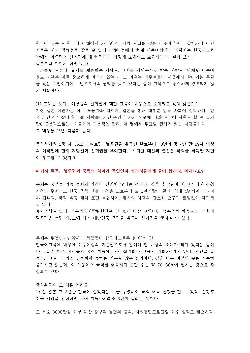 이주여성들이 국적취득을 위해 필수로 밟아야 하는 한국어교육 현실에 대한 어려움을 짧은 메모형식으로 적었다.