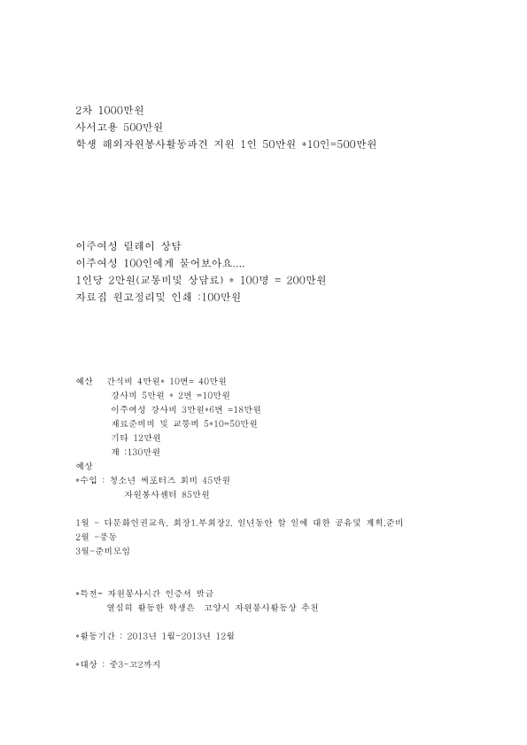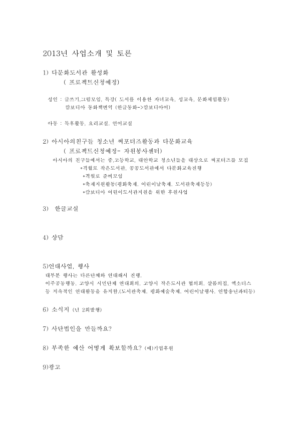 내용: 대화동 사무실 공간을 이용한 다문화교육 사업계획과 일정, 예산서