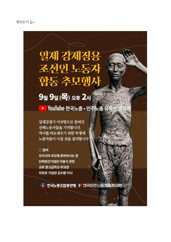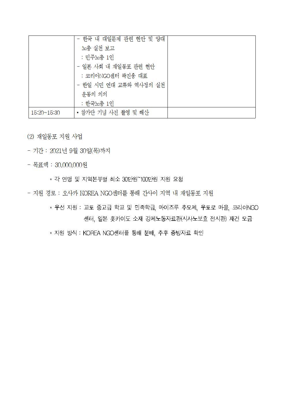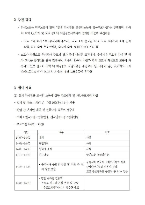 한국노총은 민주노총과 함께 “일제 강제징용 조선인노동자 합동추모사업”을 진행하며, 간사이 지역 (오사카 및 교토 등) 내 재일동포사회와의 연대를 꾸준히 추진해왔음. 관련하여 2021년 , 한국과 일본 관계단체들이 이후 지원사업의 내용이 담긴 보도자료를 발표함 * 교토 소재 마이즈루 (우시키마 추모제), 교토 소재 중고급 학교, 교토 츠루하시 소재 민족학급, 교토 소재 우토로마을, 오사카 소재 KOREA NGO센터 등