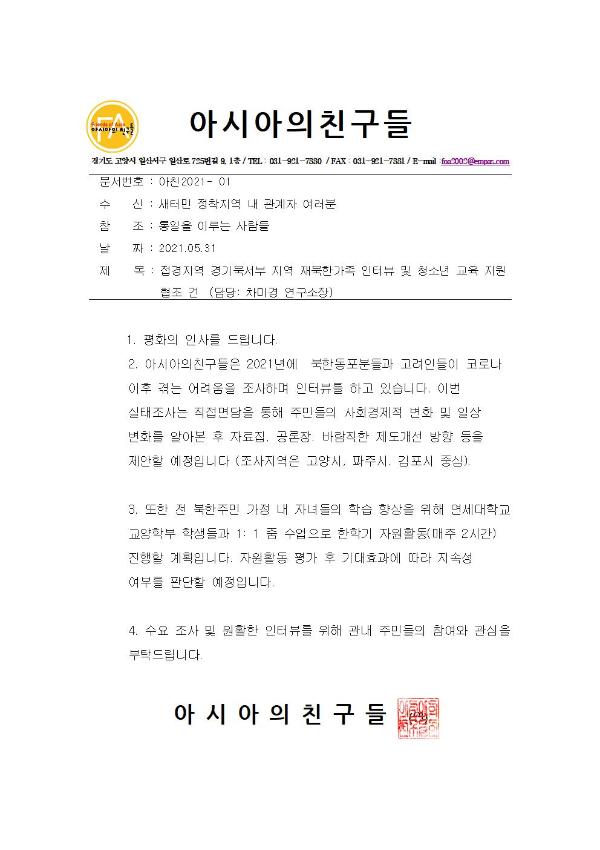 2021년 코로나 시기, 출신지나 출발지로 돌아가기 어렵고 가족친지가 없는 북한 출신 디아스포라(북향민), 고려인 대상으로 조사와 자녀 학습 지원활동을 동시에 준비하였다. 이상의 내용을 배포하고자 제작한 보도자료이다.
