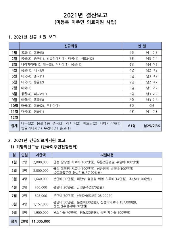 2021년 이주민 의료지원 결과