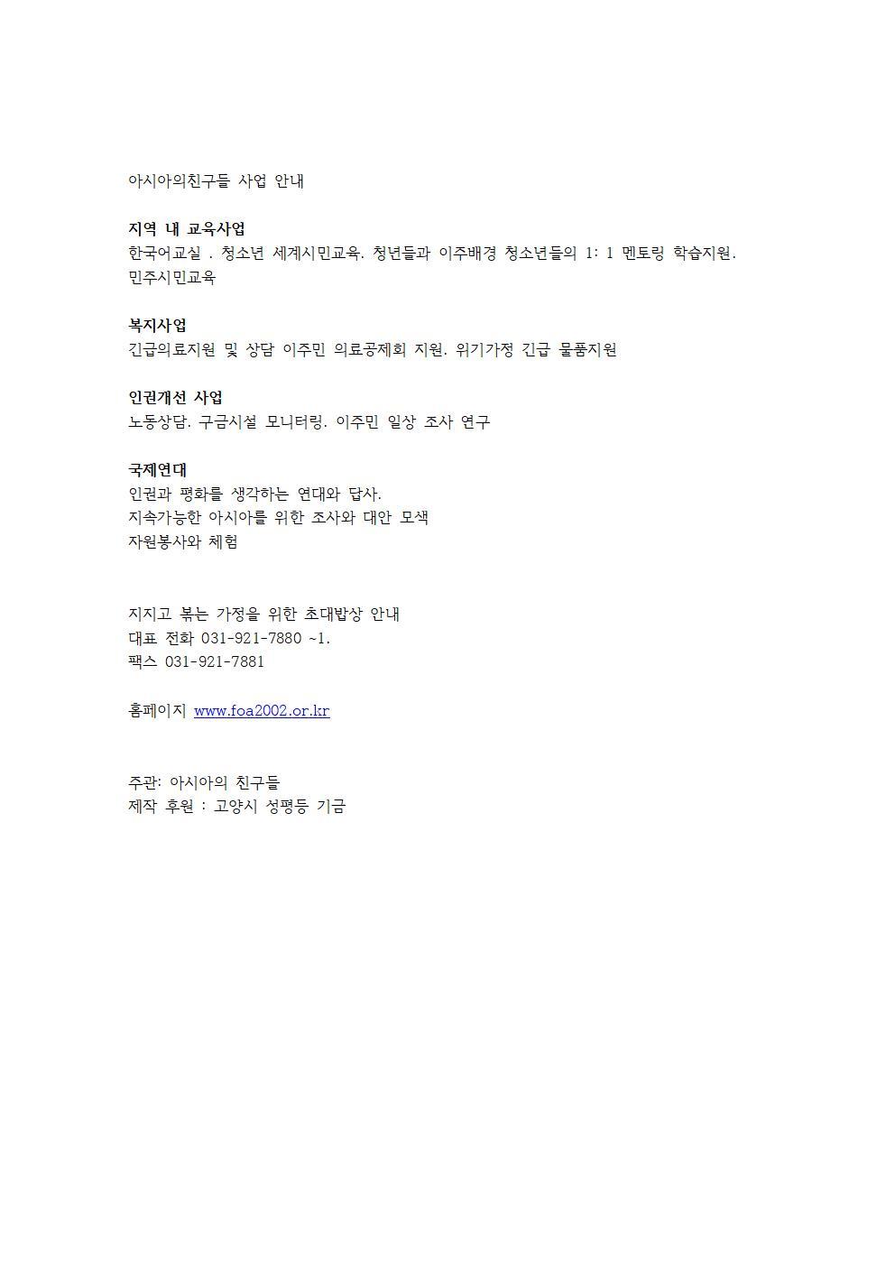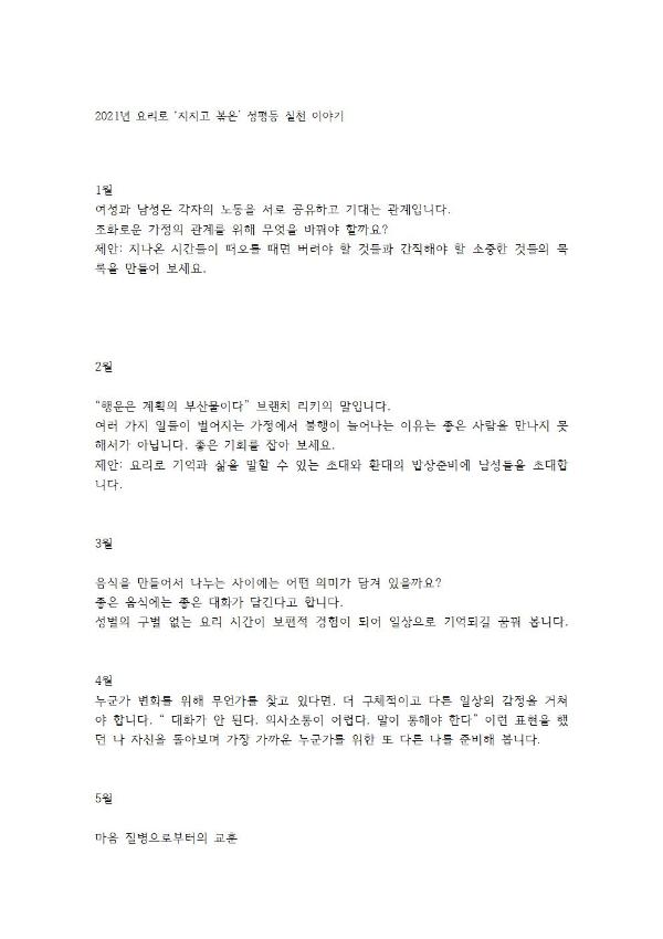 2021년 이주민 가정, 남성들과 1년 동안 요리교실을 진행한 후 이를 기념하는 사진기록을이용하여 제작된 달력 박물이다. 달력은 회원들에게 배포됨.