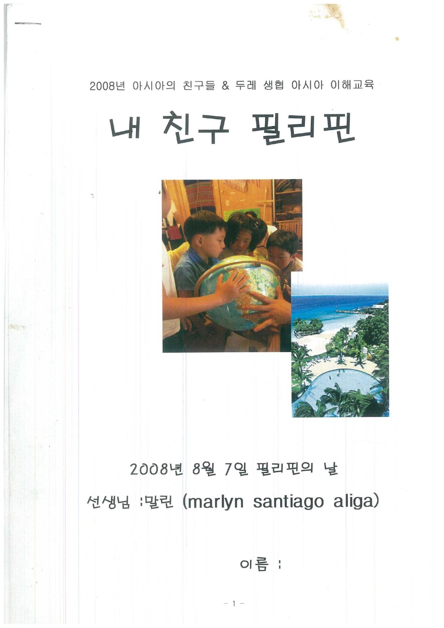필리핀의 날을 맞아 펴낸 교육메뉴얼이다. 소책자형식으로 만들어서, 고양시 두레 생협 회원들의 자녀들 대상으로 진행한 아시아이해교육 프로그램에 이용했다. 메뉴얼 구성에는 차미경, 김지영, 말린이 공동으로 했고, 강의 진행은 말린(필리핀 귀화 이민자)이 담당했다. 교재는 한국어로 구성되어 있다.