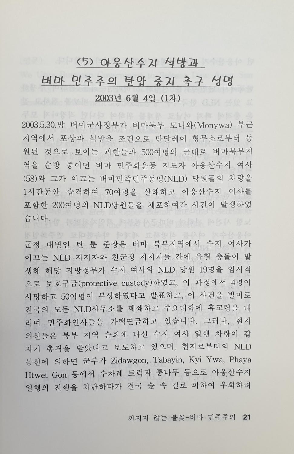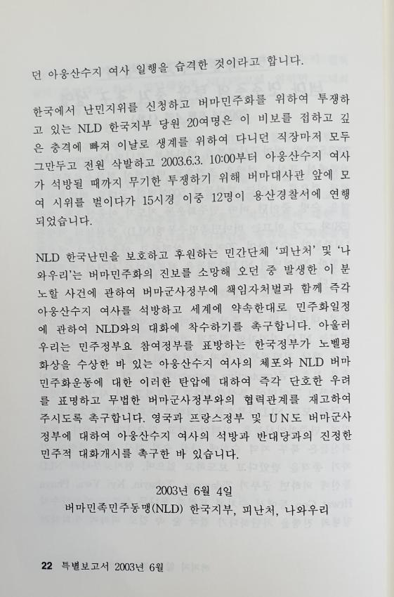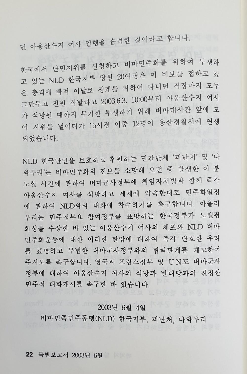 2003년 5월 30일밤 구속된 아웅산수지 석방과 관련자 처벌, 민주화 일정에의 참여를 촉구하는 내용이다.