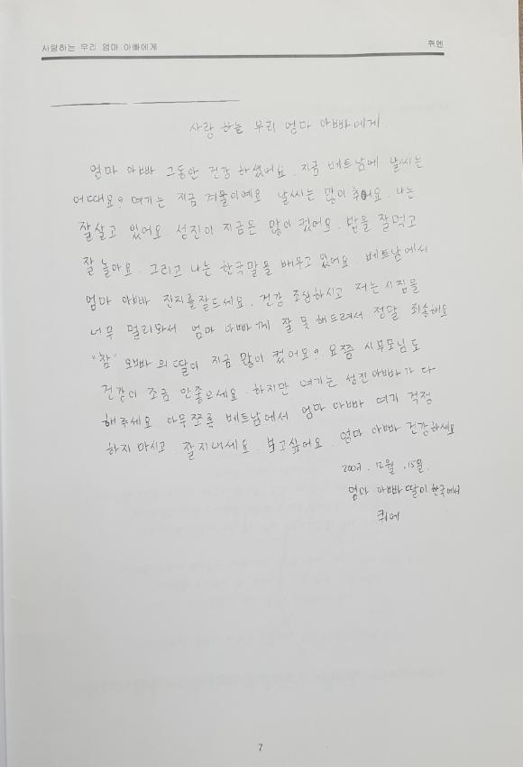 베트남에서 온 퀴엔이 부모님께 보내는 편지글이다. 한국어를 배우고 처음 쓴 편지이다.