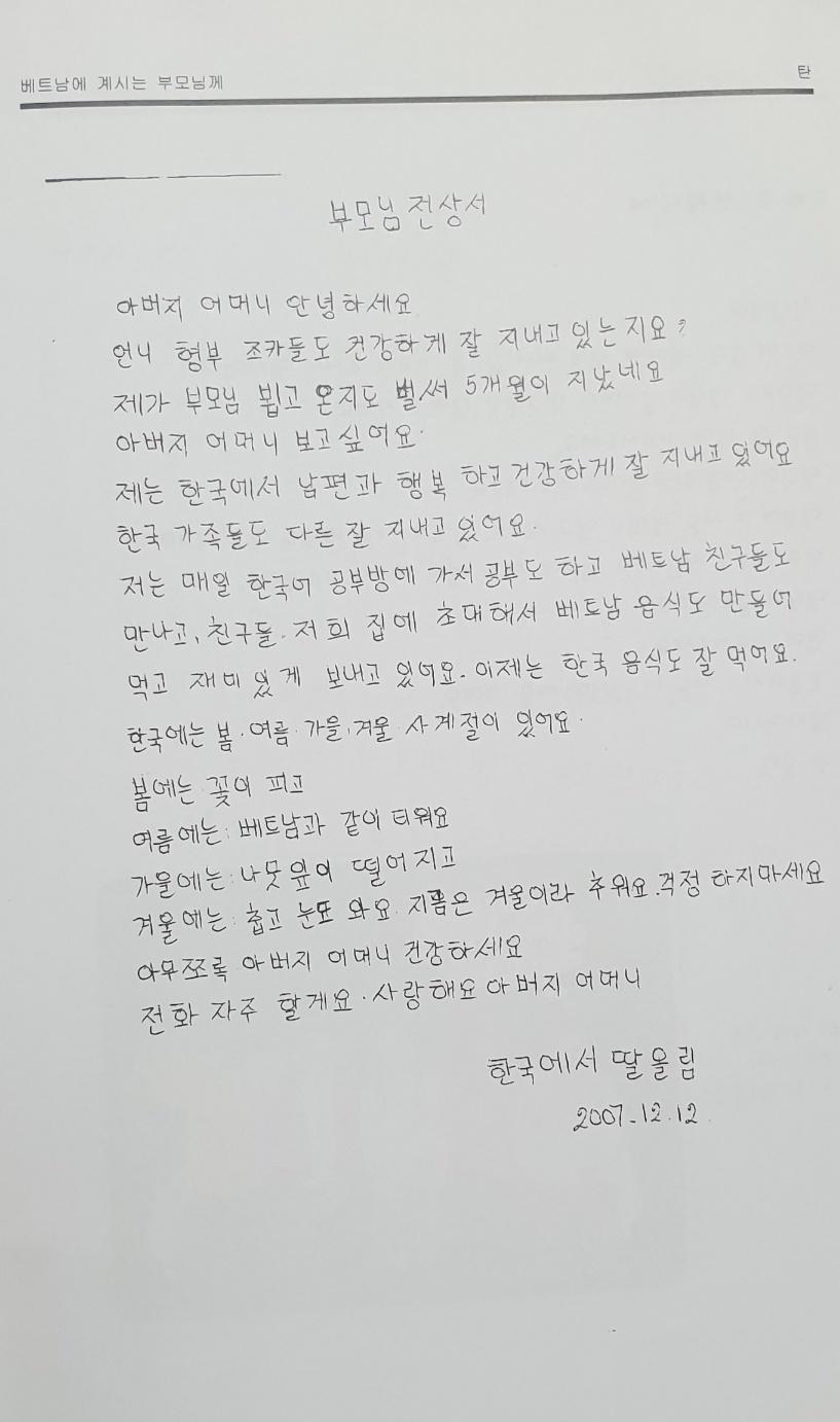 베트남에서 결혼이주해온 탄 씨가 부모님께 올리는 편지글이다.