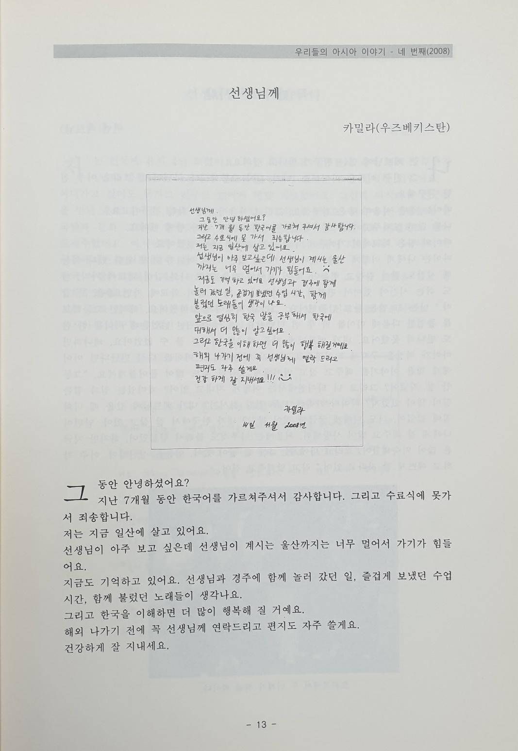우즈베키스탄에서 온 카밀라가 한국어교실 선생님께 쓴 편지글이다