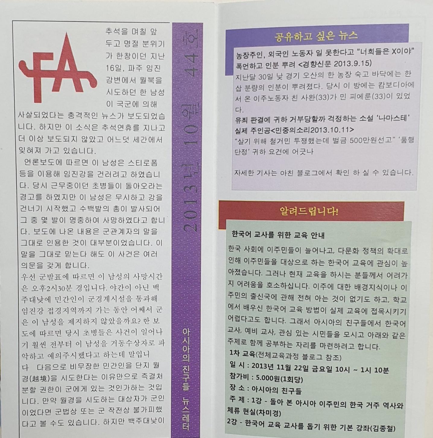 아시아의 친구들 뉴스레터 2013년 10월 44호
