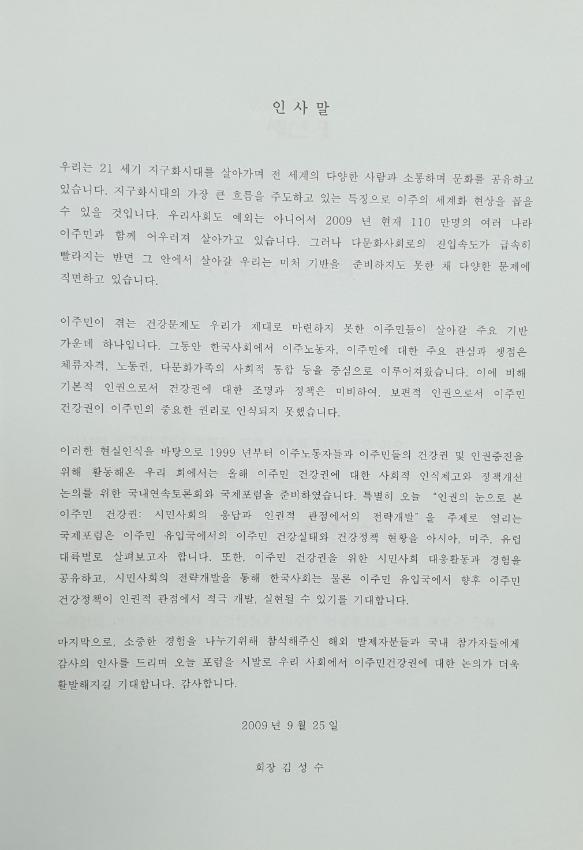 빠른 다문화사회로의 진입속도에 미치지 못하는 다양한 문제중 보편적 인권으로서의 이주민의 건강권에 대한 사회적 인식제고와 정책개선을 위한 국제포럼 보고서이다