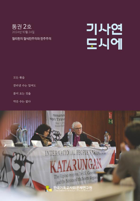 한국 기독교사회문제연구원에서 2024년 발간한 도시에 통권 제2호이다. 자료집은 4개의 글로 구성되어 있다. 필리핀 내부 실정에 대한 분석을 위해 브뤼셀에서 열린 필리핀을 주제로 한 국제민중재판부터 필리핀 기독교가 개입한 사회적 저항운동과 권력에 대한 비판의 글을 담고 있다.