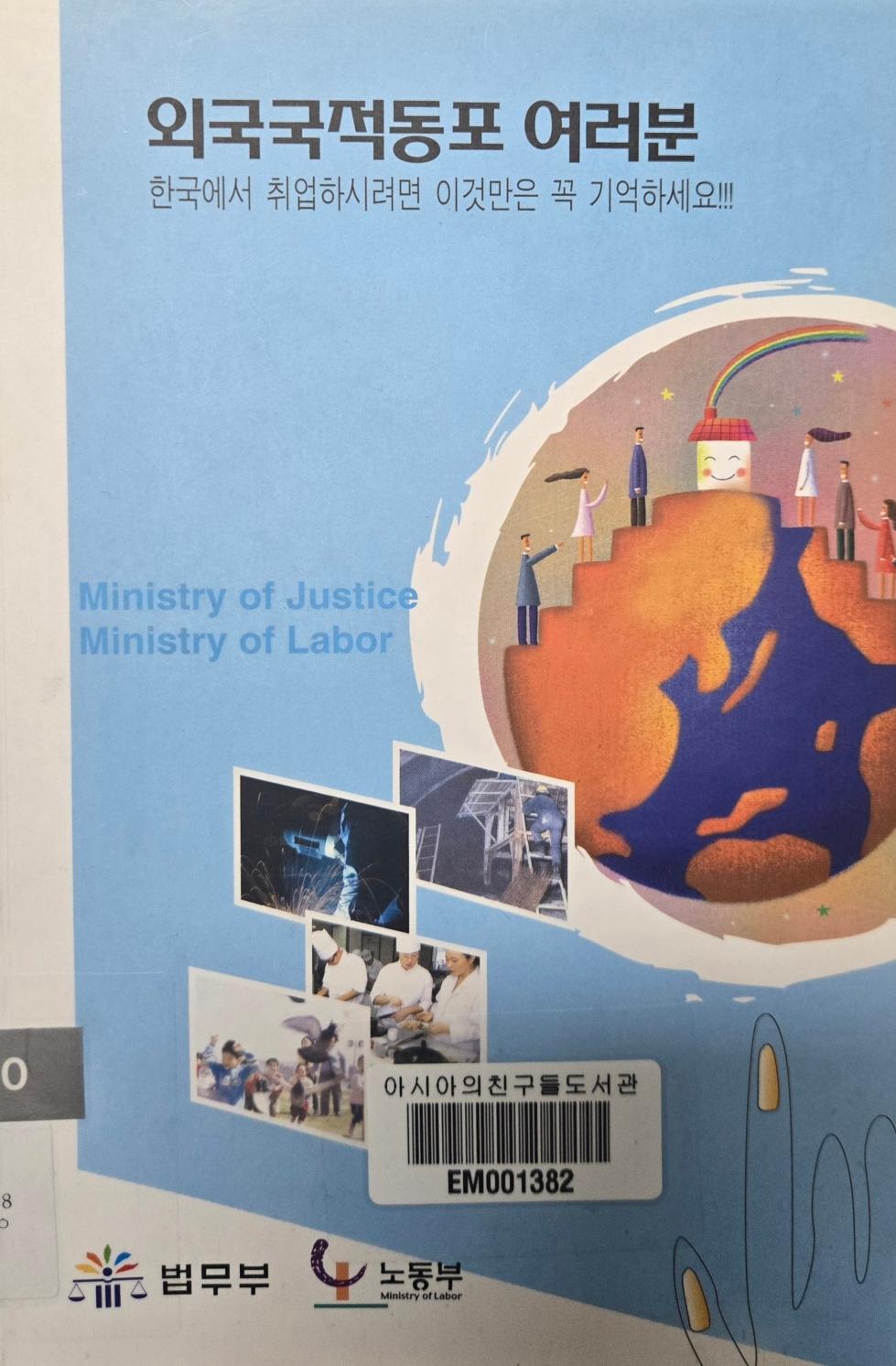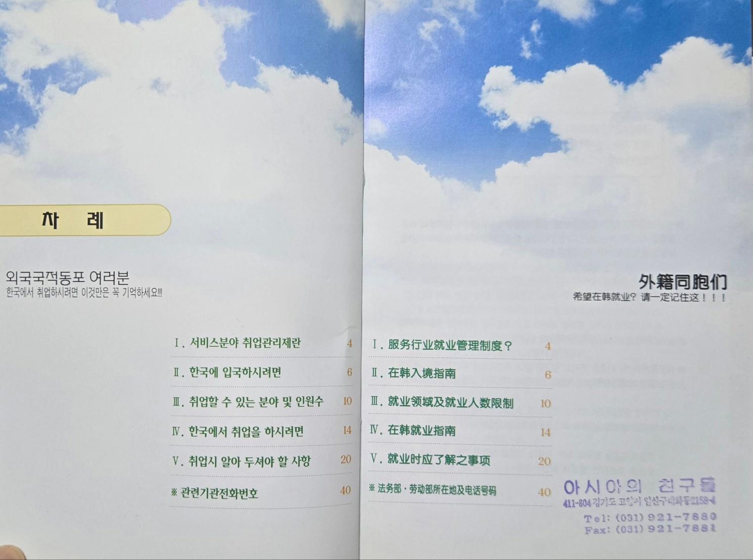 법무부와 노동부에서 펴낸 한국에서 취업을 하기위한 외국국적동포에 대한 안내책자이다