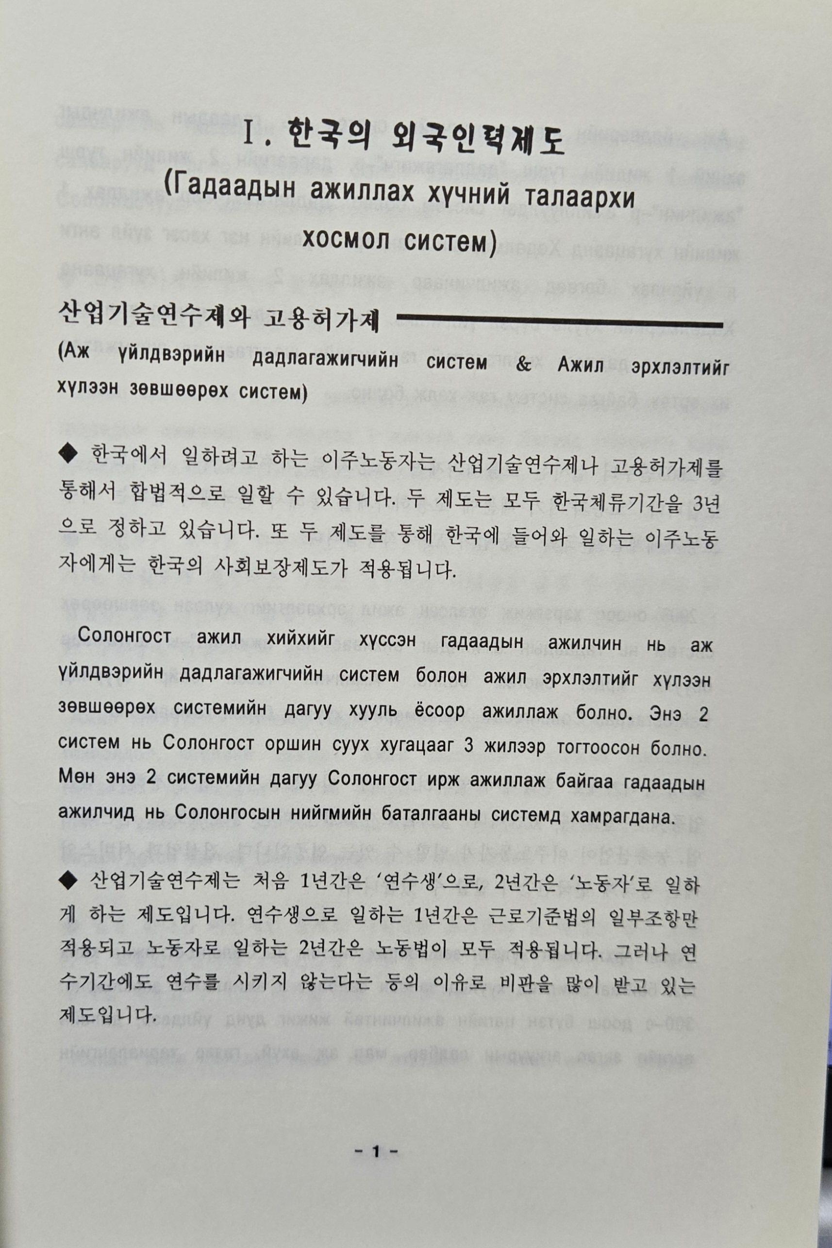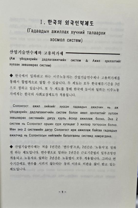 이주노동자를 위한 한국어와 러시아어로 된 노동법 자료이다