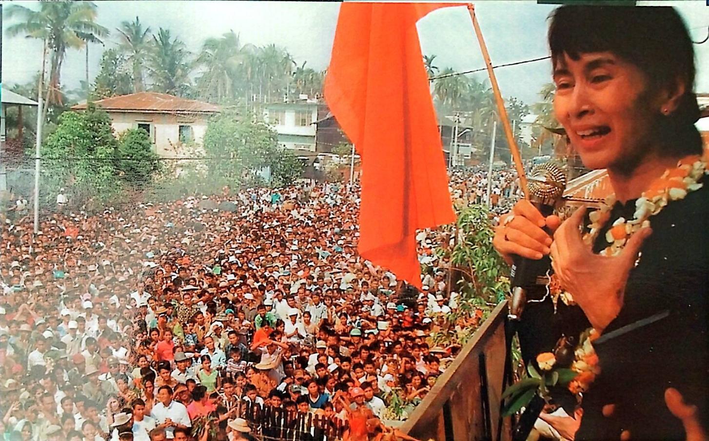 1988 미얀마 민주 항쟁 당시, 버마 남서부 아라칸 주에서 대중 앞에 선 아웅산 수키 여사
