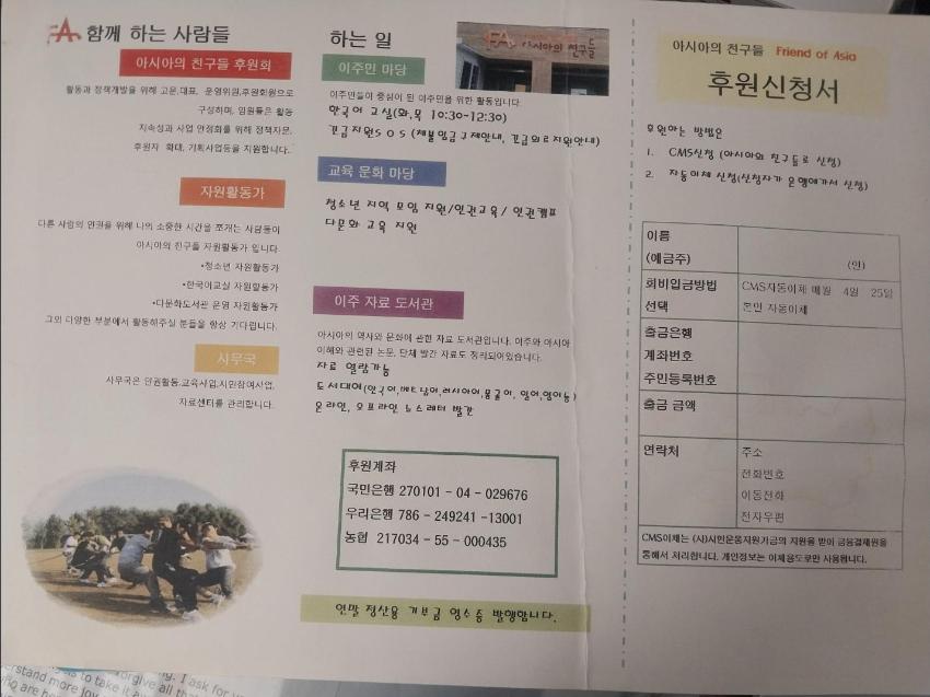 아시아의친구들 후원자 조직을 위해 제작한 브로셔이다. 활동 소명과 주 활동을 안내하였다.