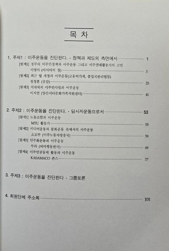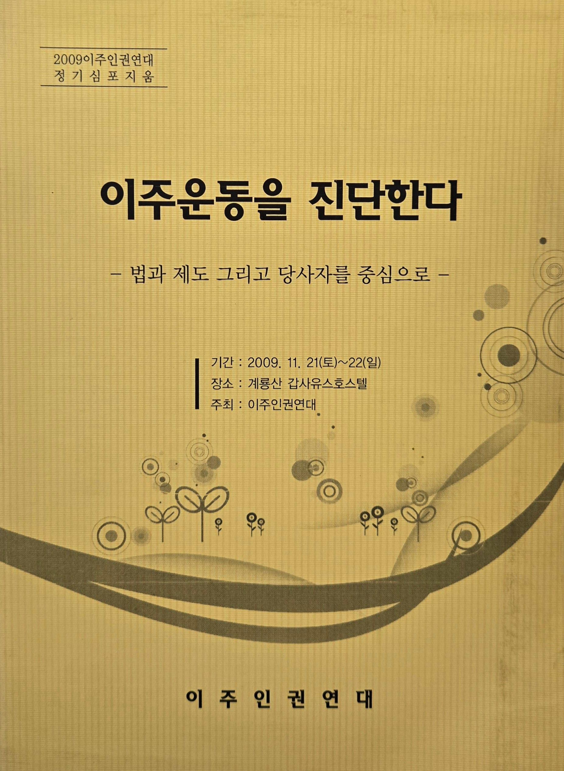 2009년 이주인권연대 정기심포지움 자료집으로 법과 제도 측면과 당사자운동으로서의 측면에서 이주운동을 진단하고 있다