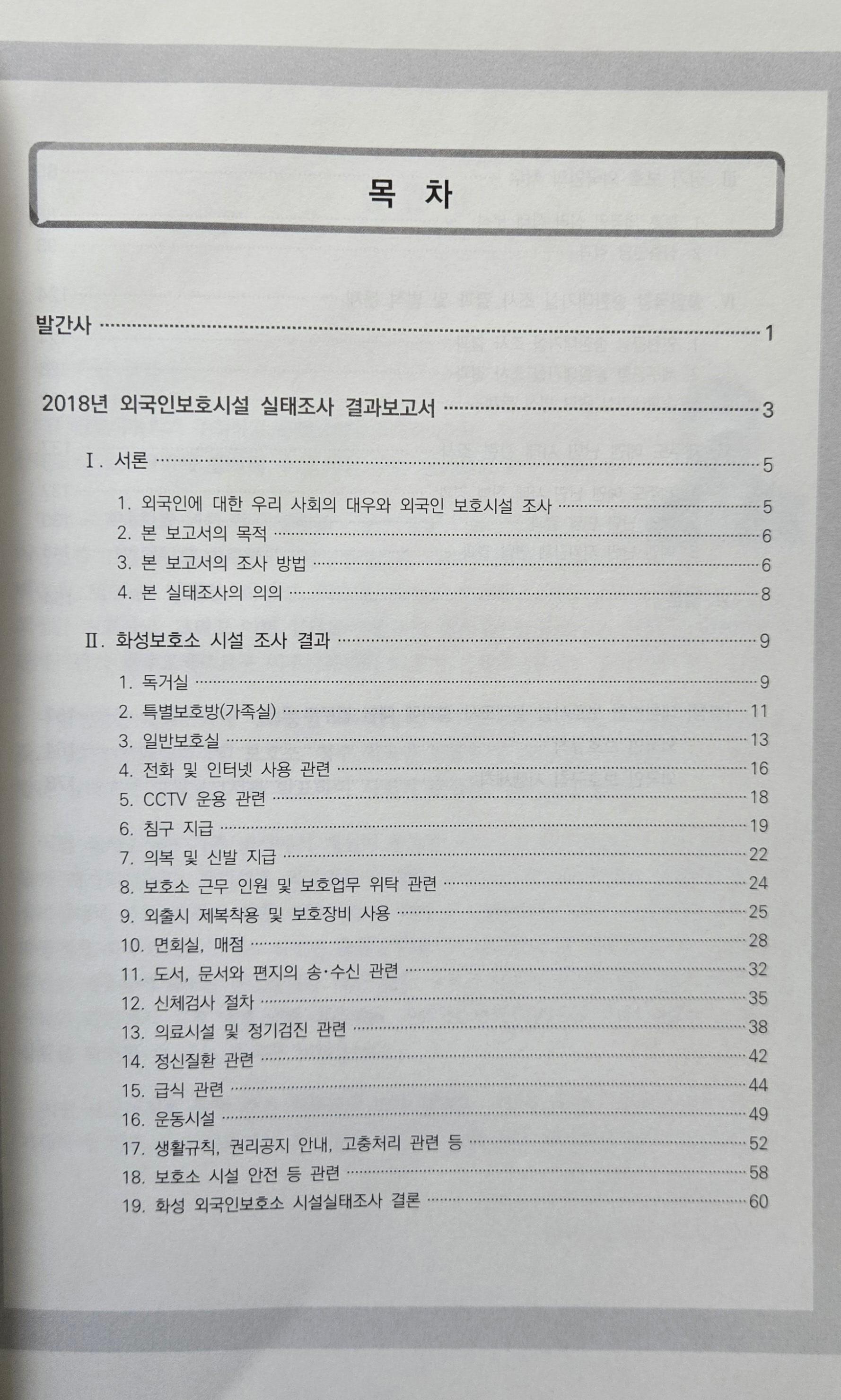 기존 조사에서 개선이 필요한 사항으로 언급되었던 보호시설의 문제점들이 개선되었는지, 장기보호 외국인들에 대한 심리상담 및 심층면접을 진행해 불안정한 심리상태에 따른 문제에 대처하는 방안은 어떤지등에 대한 실태조사 자료집이다