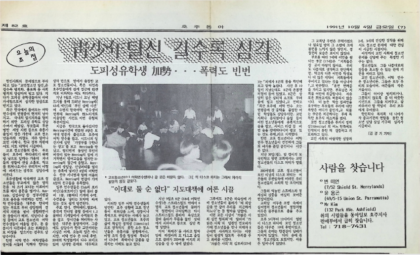 1991년 10월 4일자 호주동아 신문에 실린 기사로 한인사회의 문제점으로 부각되고 있는 교민청소년 탈선이 갈수록 심각해지고 있으며 도피성 유학생이 가세하면서 폭력도 빈번하다는 내용이다