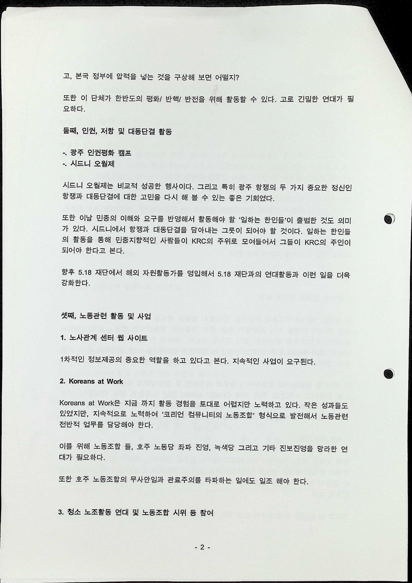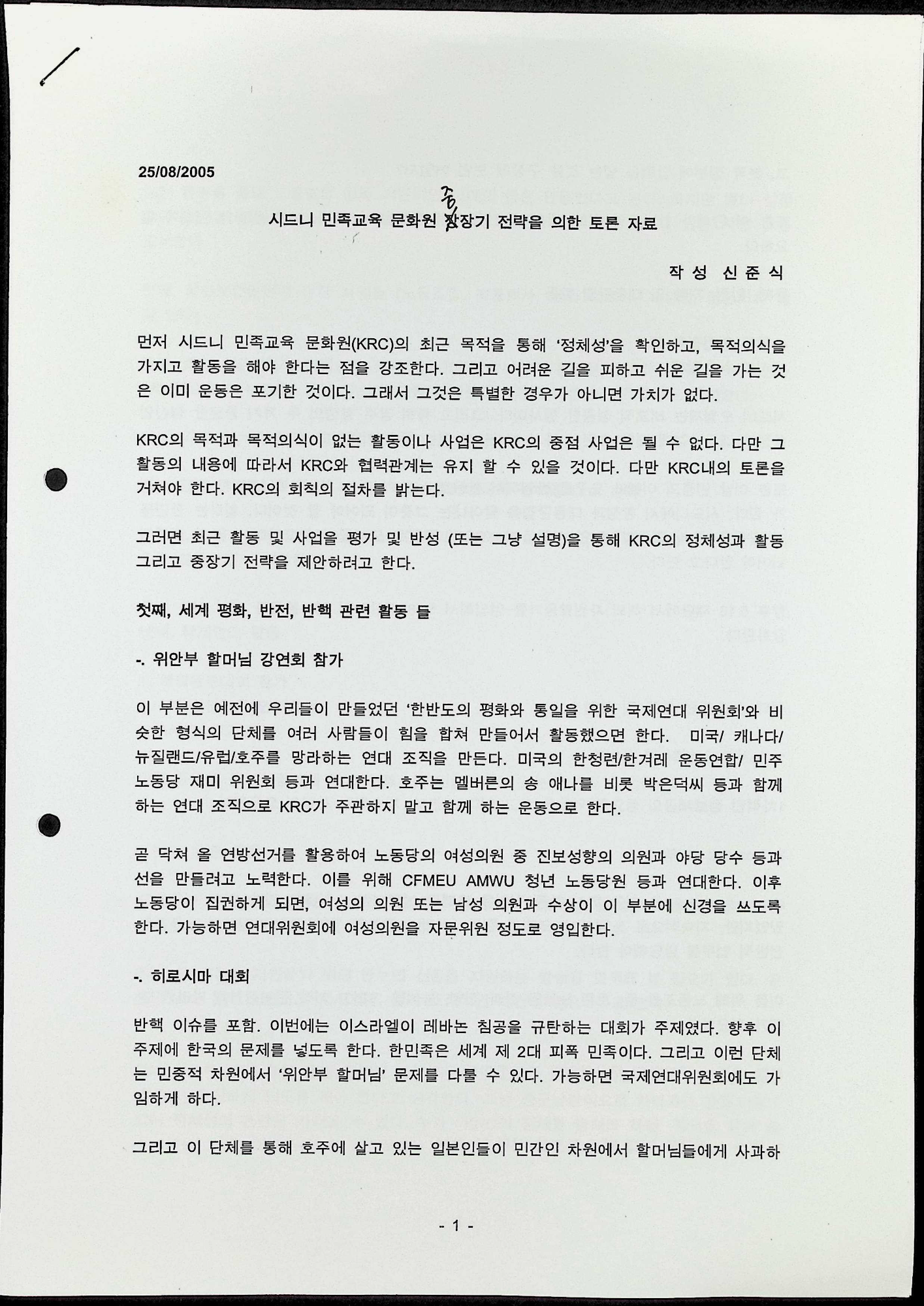2005년 8월 25일에 있었던 시드니 민족교육문화원 중장기 전략을 위한 토론회에서 신중식이 작성한 토론회 자료이다