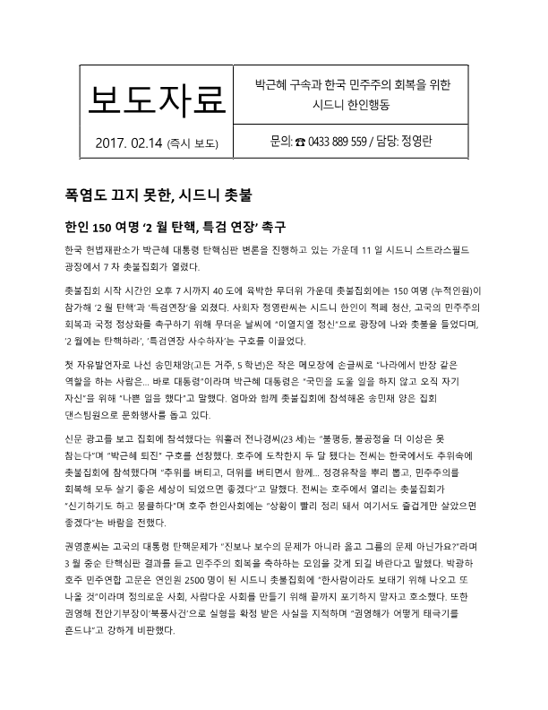 2017년 2월 11일 스트라스필드에서 있었던 박근혜 퇴진과 민주주의 회복을 위한 7차 시드니 집회, '폭염도 끄지 못한 시드니 촛불'에 관한 보도자료와 사진, 포스터 등이다