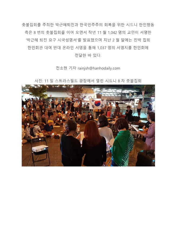 2017년 3월 11일 스트라스필드에서 있었던 박근혜 퇴진과 민주주의 회복을 위한 8차 시드니 집회로 헌재의 탄핵 인용후 마무리 집회 형식으로 이루어졌다. 이에 대한 보도 자료와 사진, 축하 영상등이다.