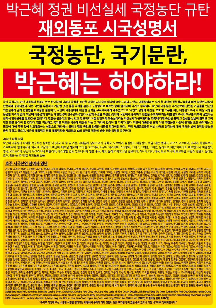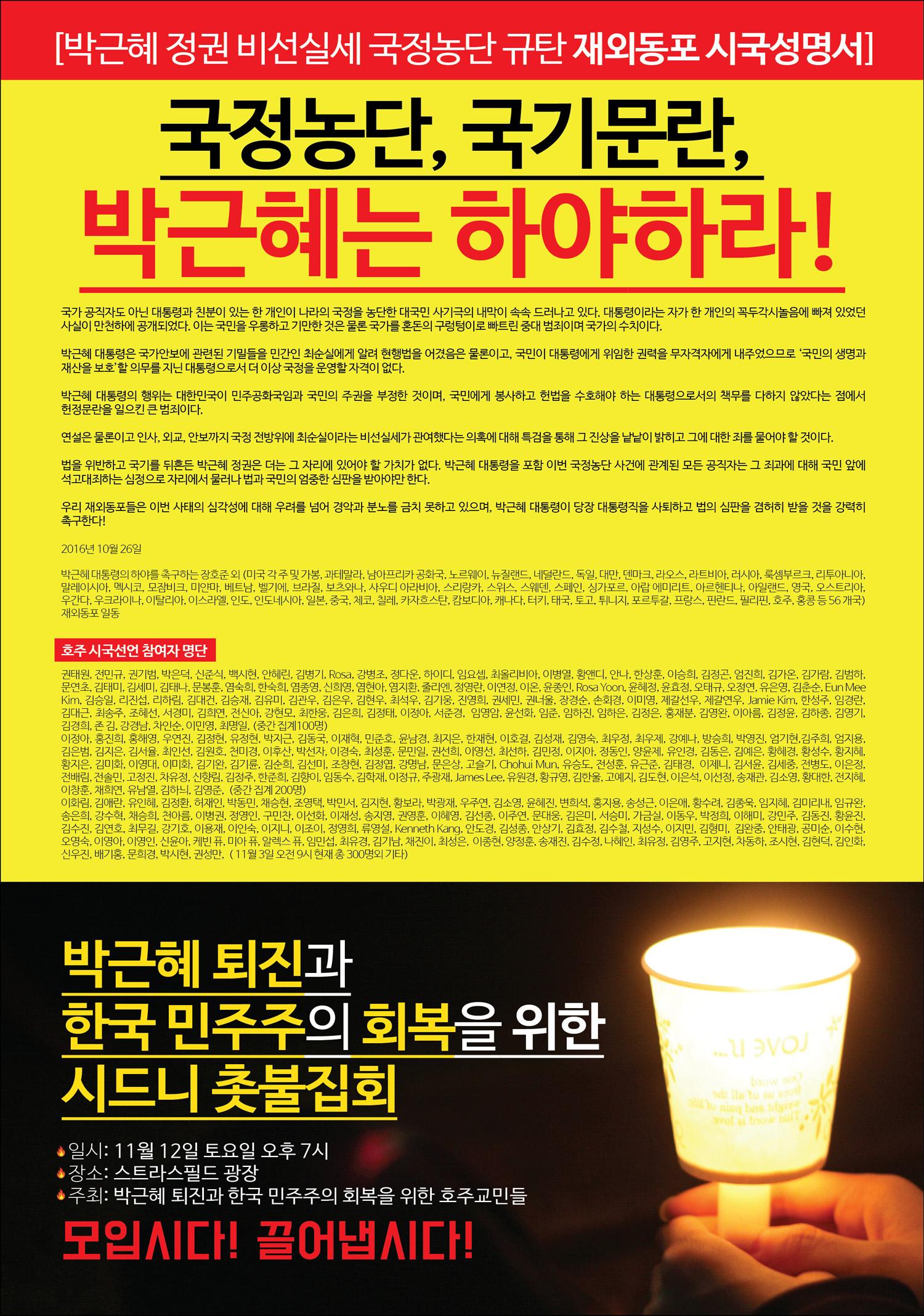 2016년 10월 말 박근혜-최순실 국정농단 사건 이후 11월 호주 시민 단체등에서 올린 시국성명서와 그 명단, 박근혜 퇴진을 위한 촛불집회에 대한 광고 등이다
