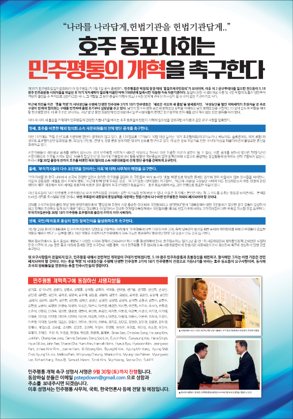“나라를 나라답게, 헌법기관을 헌법기관답게..” 라는 슬로건으로 호주민주연합에서 ‘민주평통의 개혁’을 촉구하는 성명서를 냈다