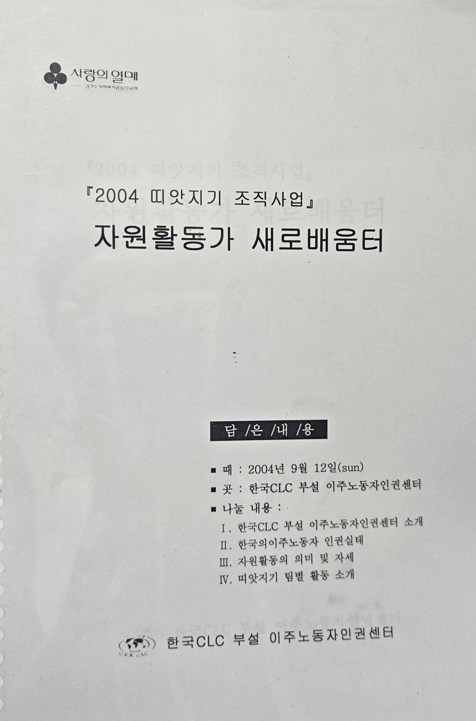 2002년 이주노동자들이 인종, 문화, 종교, 국적, 언어의 차이를 넘어 인권을 존중받으며 더불어 살아가는 우리릐 이웃으로 함께 하고자 설립된 한국CLC ( Cristian Life Community )부설 이주노동자인권센터에서 함께 할 자원활동가 교육용으로 사용된 자료이다