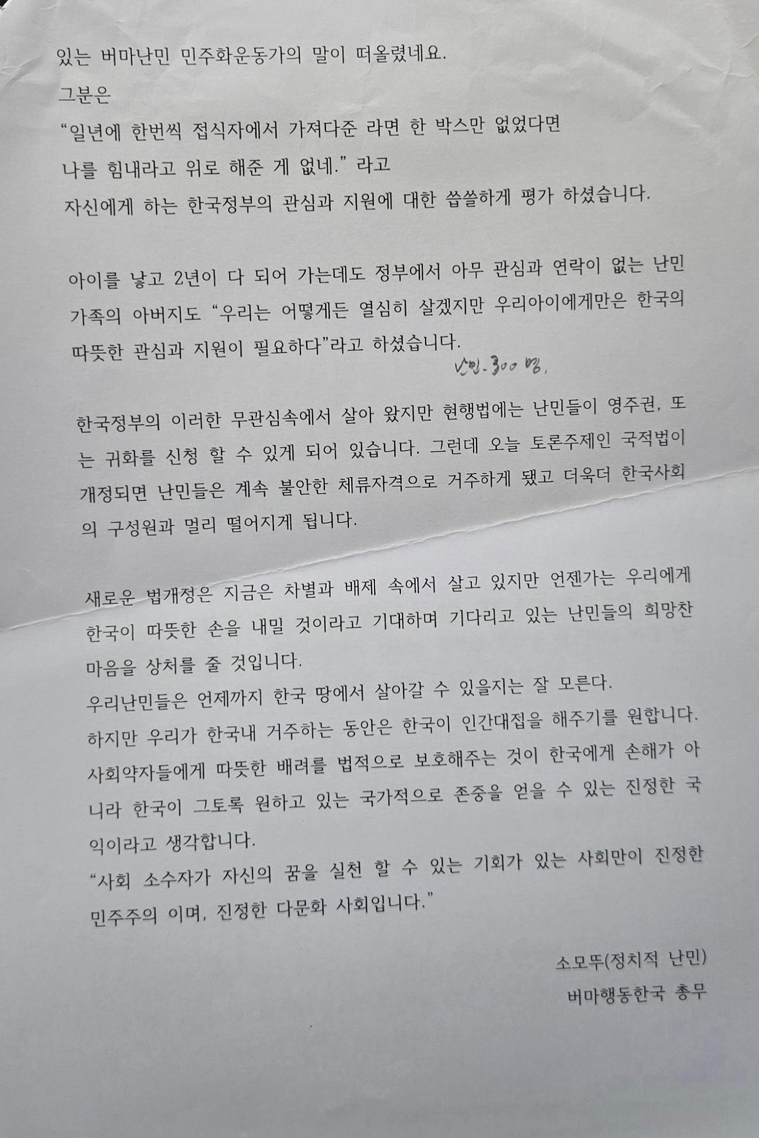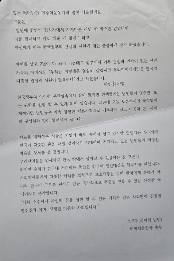 정치적 난민이자 버마행동 한국 총무인 소모뚜씨가 한국사회에서 사회적 약자인 난민에 대한 따뜻한 배려를 법적으로 보호해주는 것이 한국의 국가적 이익을 위해서도 도움이 될 것이라 호소하는 글이다