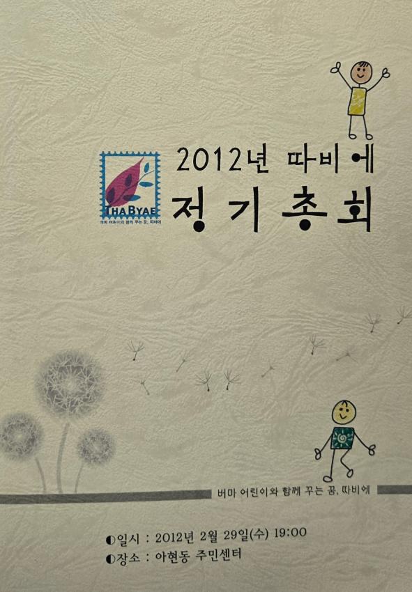 버마 어린이 · 청소년의 교육받을 권리를 실현하기 위한 활동을 수행하는 따비에의 제 2 회 정기총회 자료이다. 버마 어린이 · 청소년을 위한 마을 도서관 지원 / 버마 난민 청소년을 위한 유스센터 운영 / 버마 어린이를 위한 책 지원 사업 / 한국 청소년과 버마 청소년의 교류 사업 등을 펼치고 있다