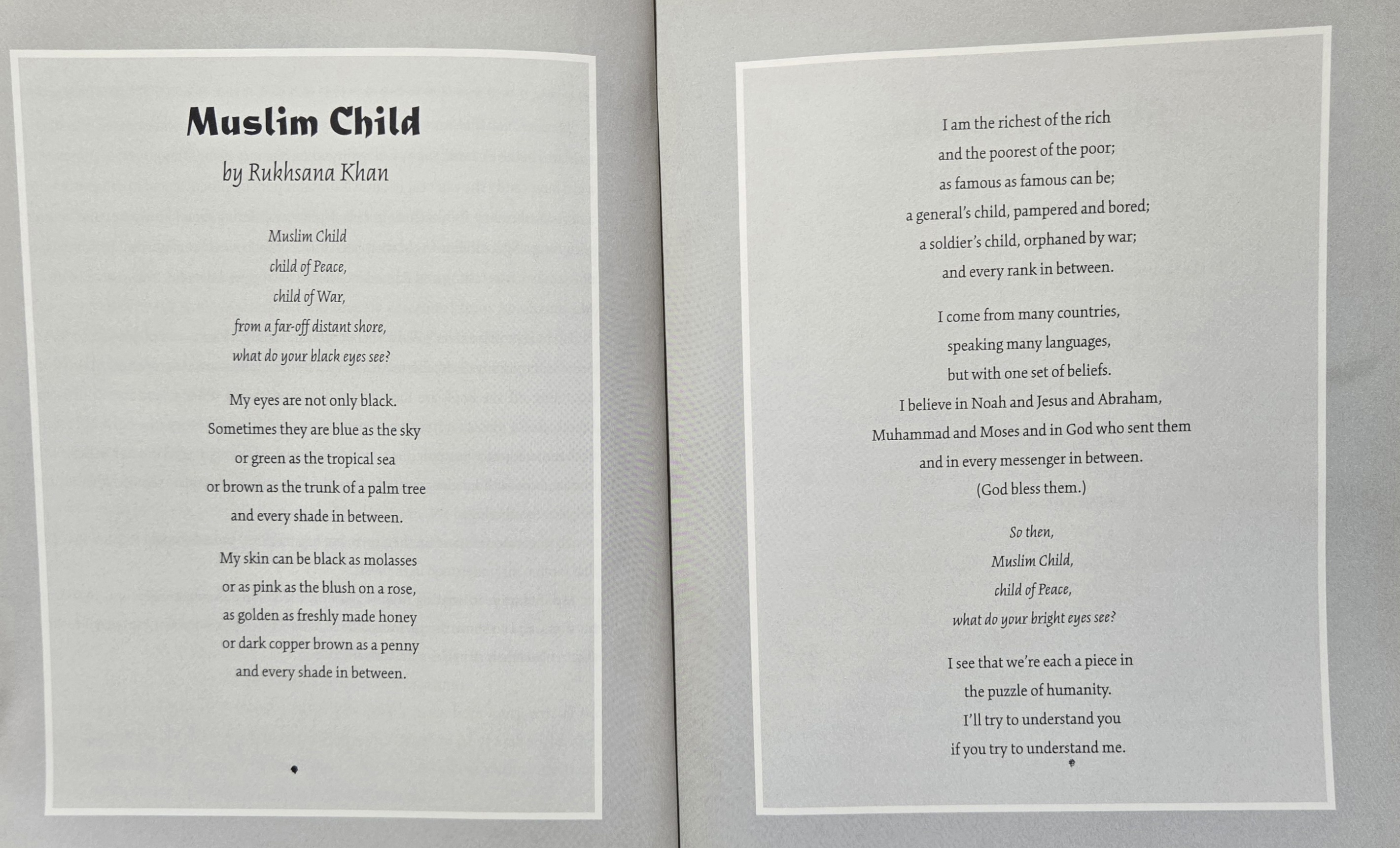 Understanding Islam through Stories and Poems 무슬림에 대한 오해를 바로잡고, 일상적인 무슬림 어린이들의 이야기와 그들의 신앙과 적응에 대한 어려움을 이야기하며 이슬람의 개인적인 면모를 보여주기 위해 Rukhsana Khan이 글을 쓰고 Patty Gallinger가 그림을 그린 책이다
