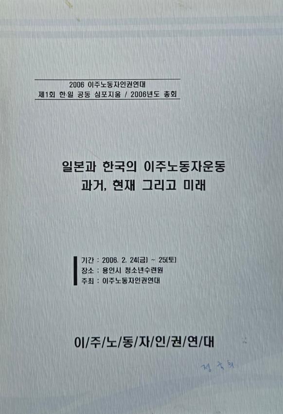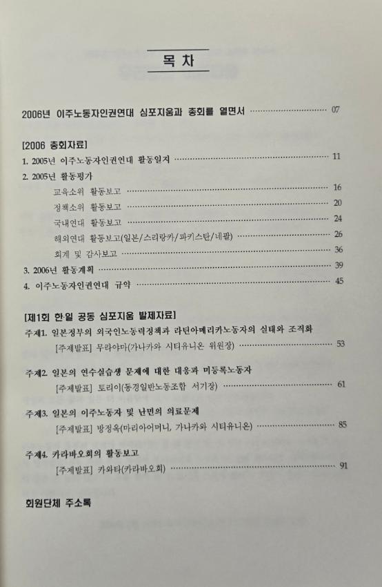 2006년 2월 24일부터 25일 까지 열린 2006 이주노동자인권연대의 제 1 회 한·일 공동 심포지움과 총회 자료집이다 일본정부의 외국인 노동력 정책과 라틴아메리카 노동자의 실태와 조직화 / 일본의 연수실습생 문제에 대한 대응과 미등록노동자 / 일본의 이주노동자 및 난민의 의료문제 / 카라바오회의 활동보고 등의 주제가 담겨 있다