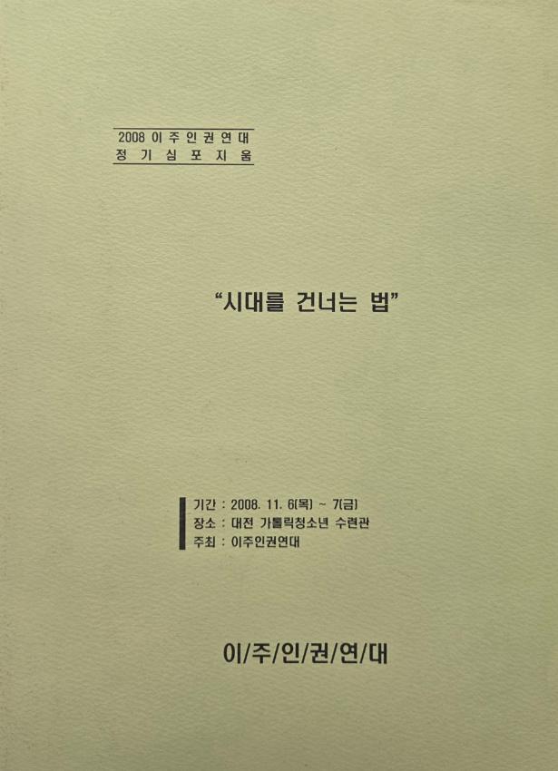 2008년 11월6일에서 7일까지 열린 이주인권연대의 정기심포지움 자료집으로 기조강연 - 시대를 건너는 법 / 새정부 하에서 이주노동자의 인권과 운동 / 새정부 하에서 다문화가족의 현실과 과제 등의 주제를 담고 있다