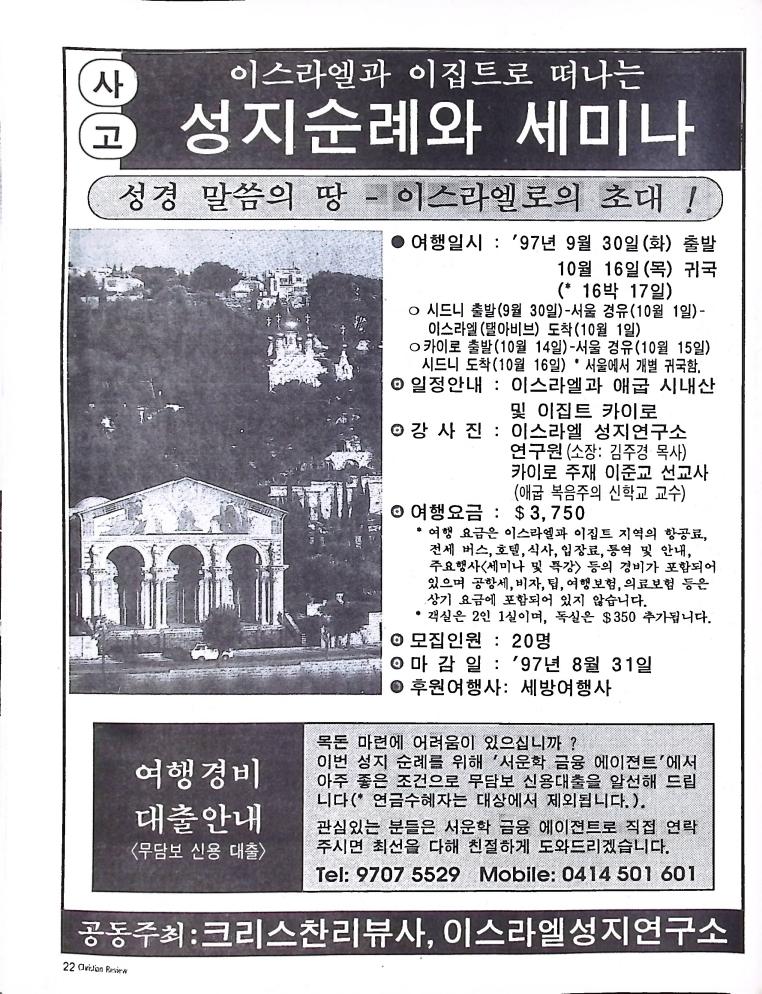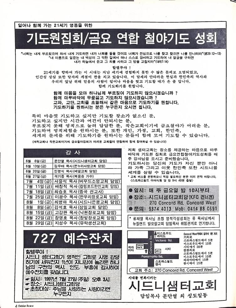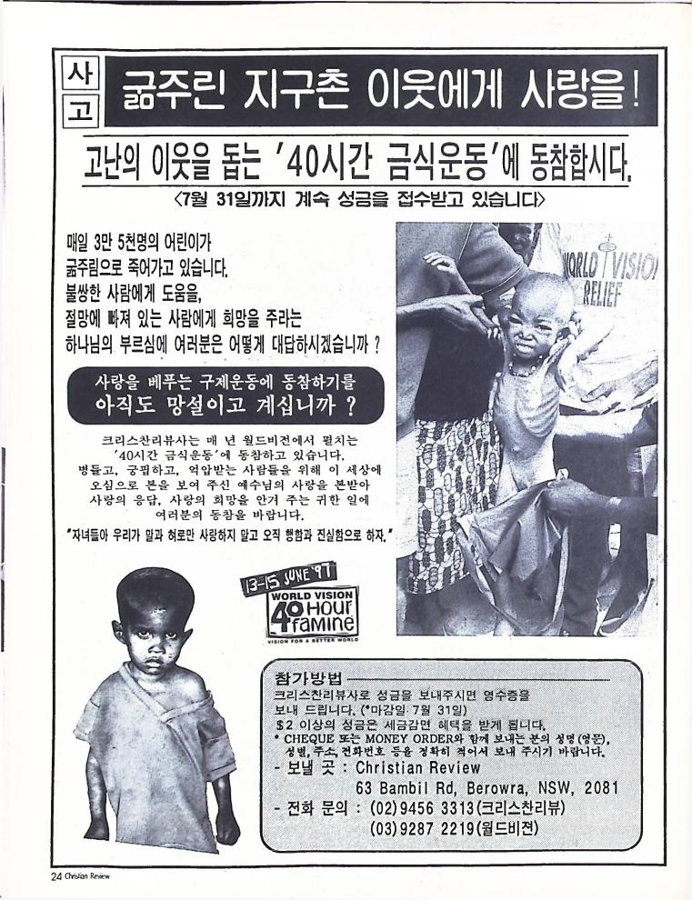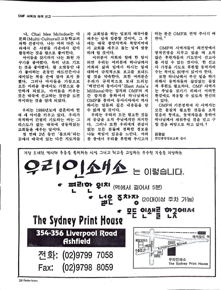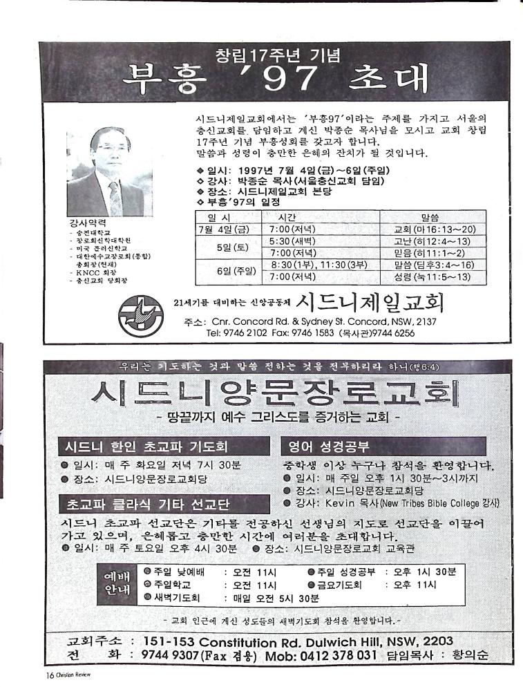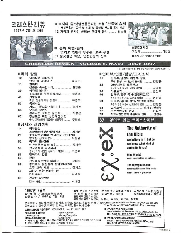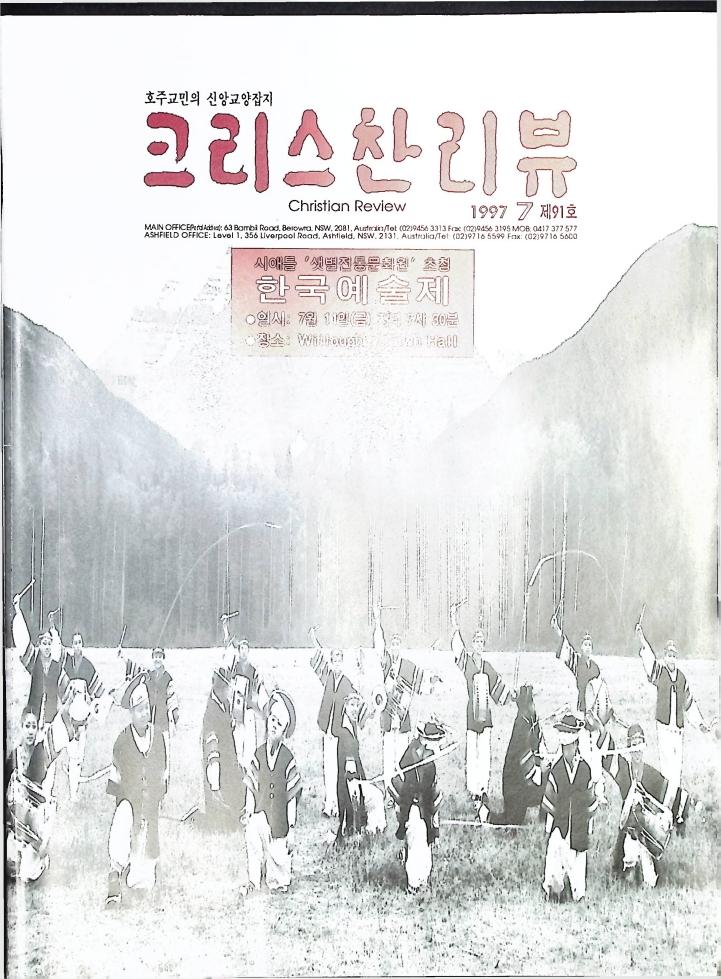 호주에서 1990년 1월부터 제작된 크리스찬 리뷰는 굳건한 신앙의 터전위에 교파를 초월한 신앙공동체로서 복음을 널리 전하기 위한 선교의 목적을 갖고 창간되었다. 생각해봅시다-1.5세들을 주목하십시오 / 목회서신-갈라서는 교회는 많은데 / 리뷰단상-포트엔젤스에서 만난 시련의 바람 / OMF사역과 태국선교