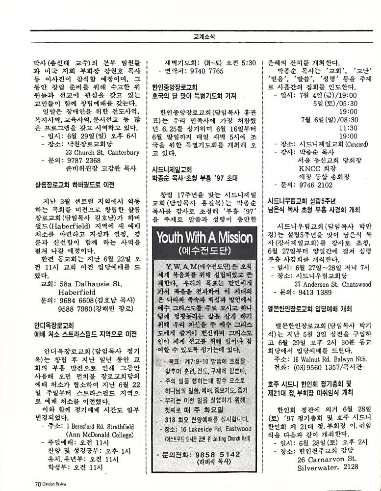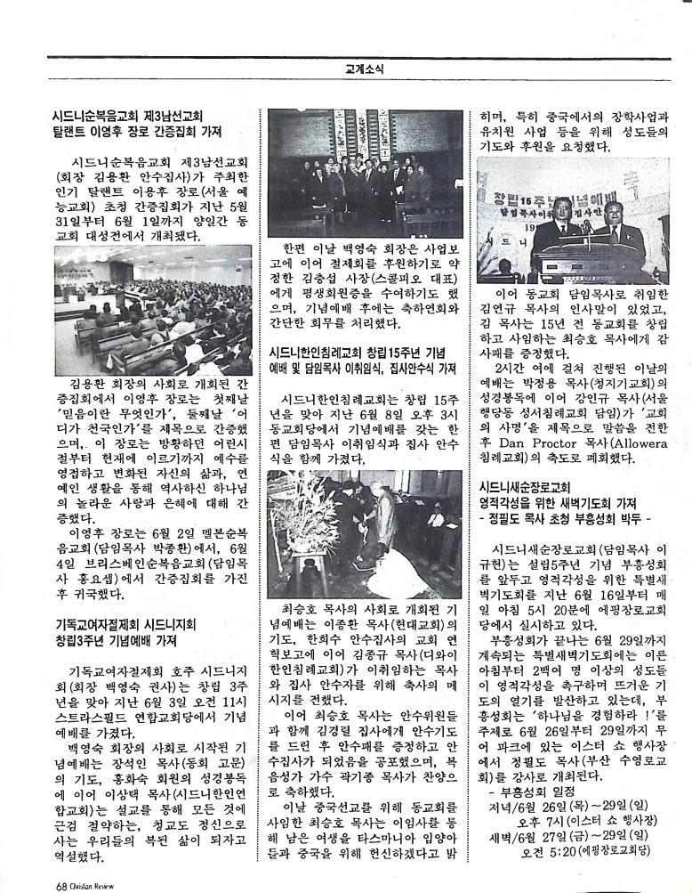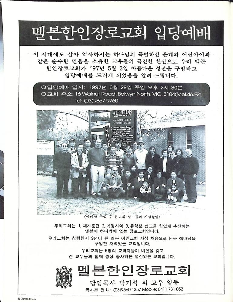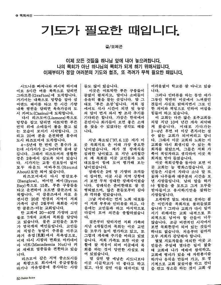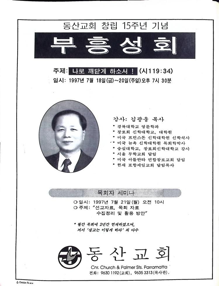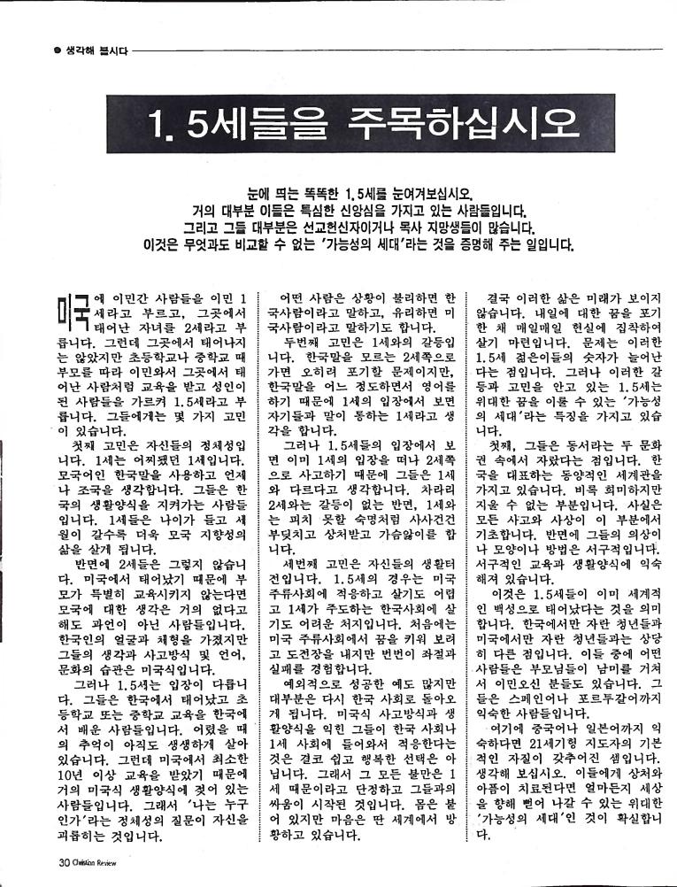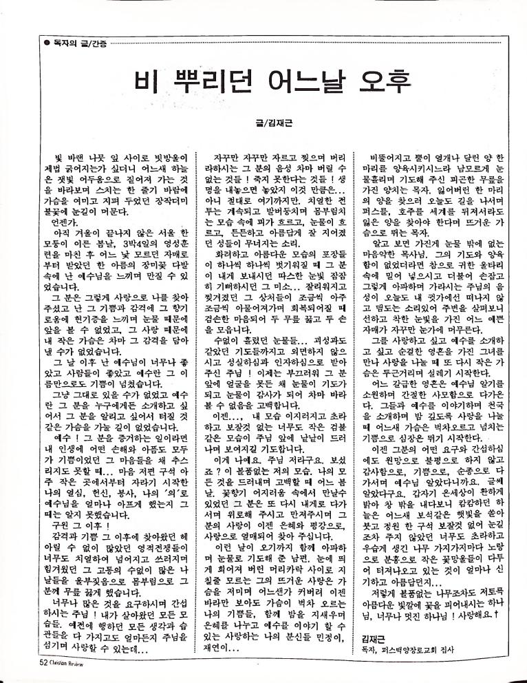 호주에서 1990년 1월부터 제작된 크리스찬 리뷰는 굳건한 신앙의 터전위에 교파를 초월한 신앙공동체로서 복음을 널리 전하기 위한 선교의 목적을 갖고 창간되었다. 생각해봅시다-1.5세들을 주목하십시오 / 목회서신-갈라서는 교회는 많은데 / 리뷰단상-포트엔젤스에서 만난 시련의 바람 / OMF사역과 태국선교
