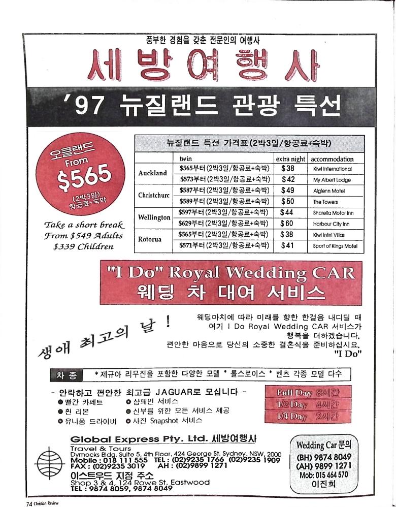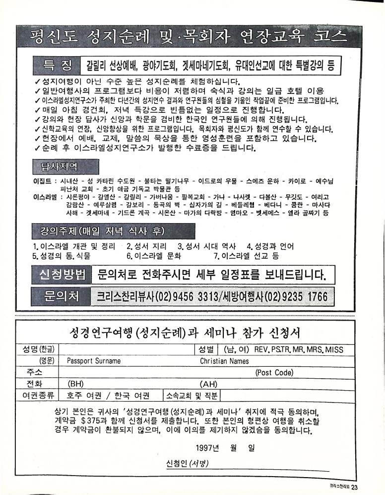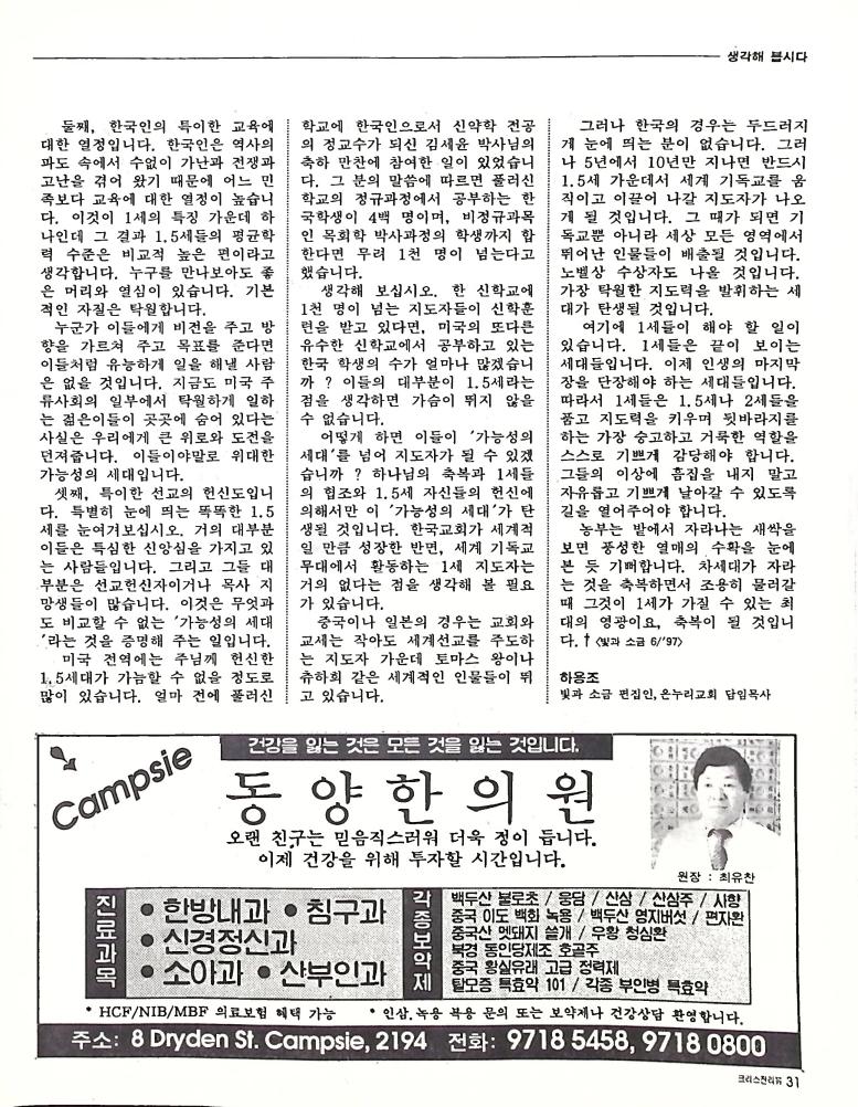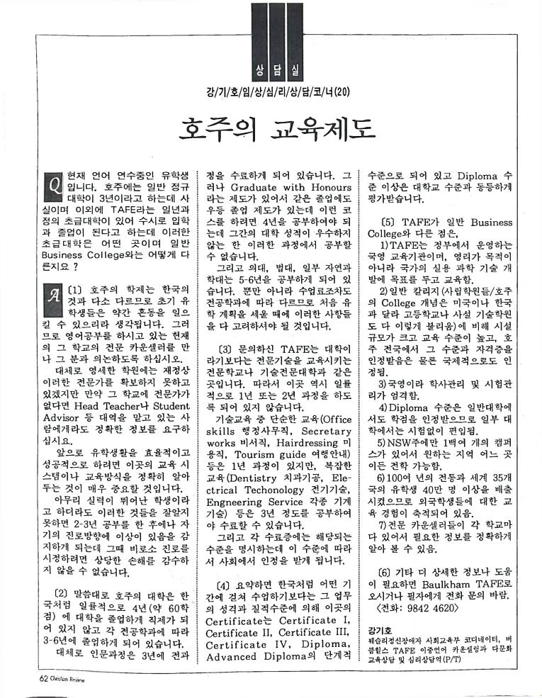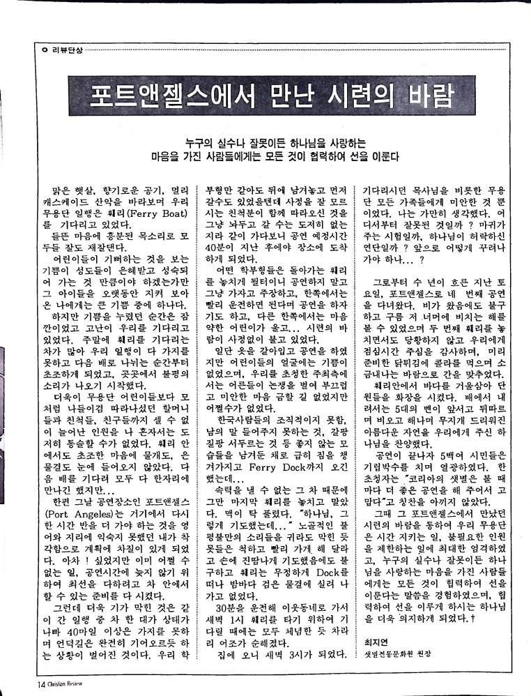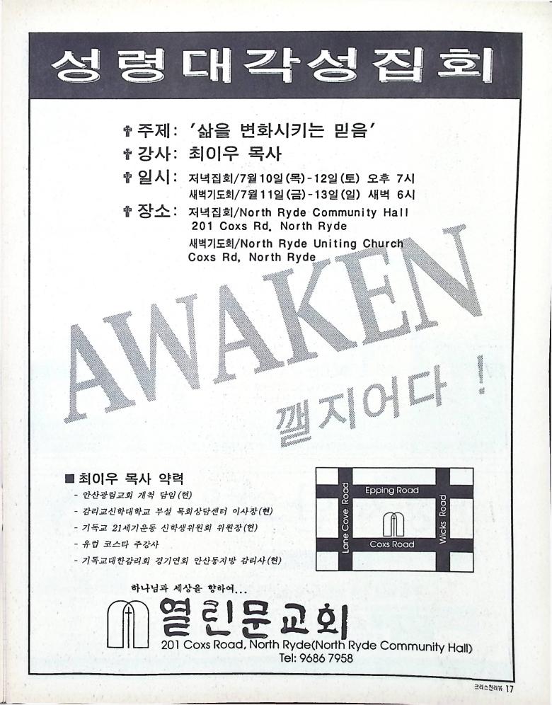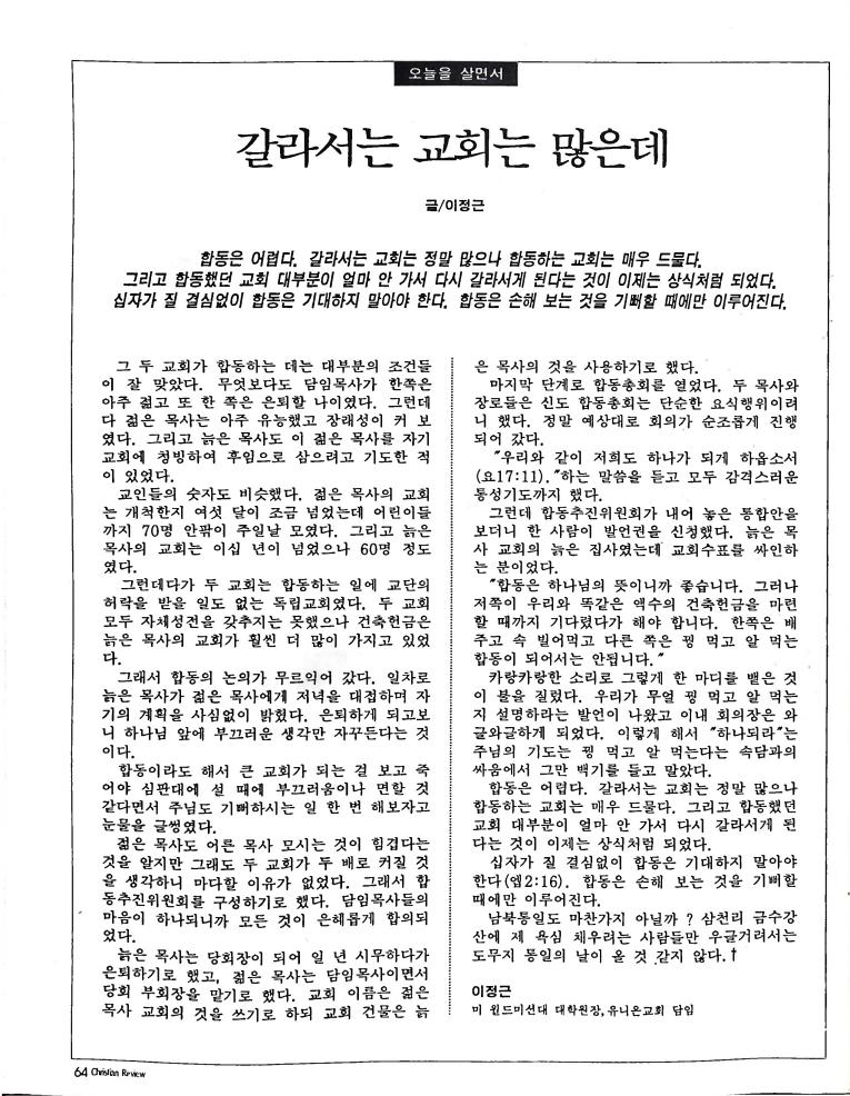 호주에서 1990년 1월부터 제작된 크리스찬 리뷰는 굳건한 신앙의 터전위에 교파를 초월한 신앙공동체로서 복음을 널리 전하기 위한 선교의 목적을 갖고 창간되었다. 생각해봅시다-1.5세들을 주목하십시오 / 목회서신-갈라서는 교회는 많은데 / 리뷰단상-포트엔젤스에서 만난 시련의 바람 / OMF사역과 태국선교