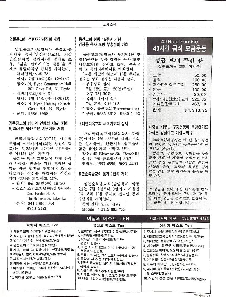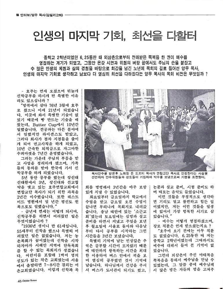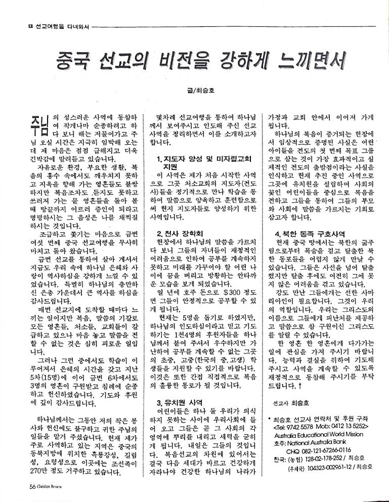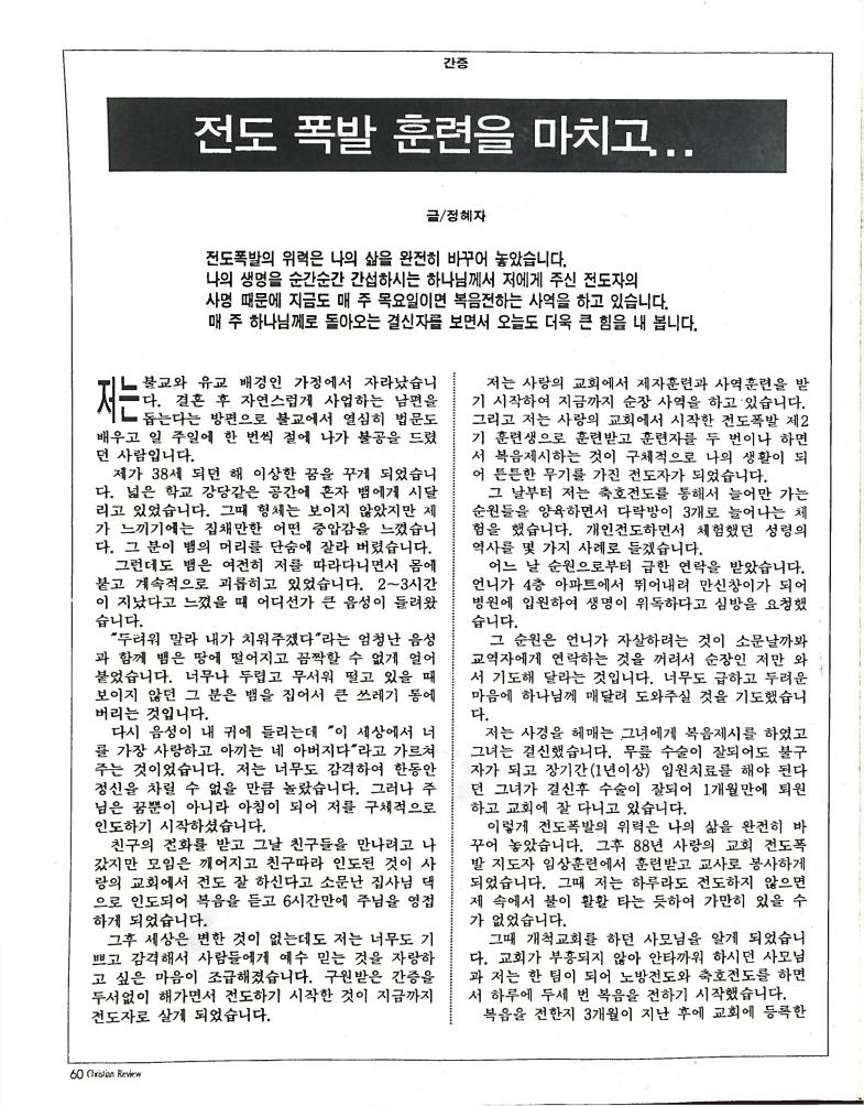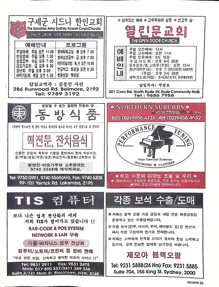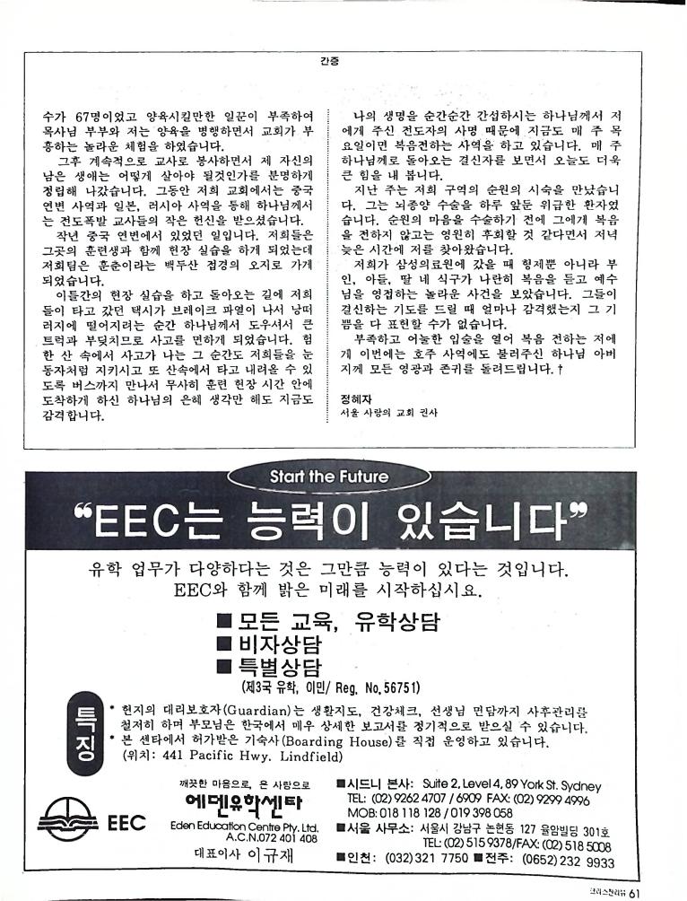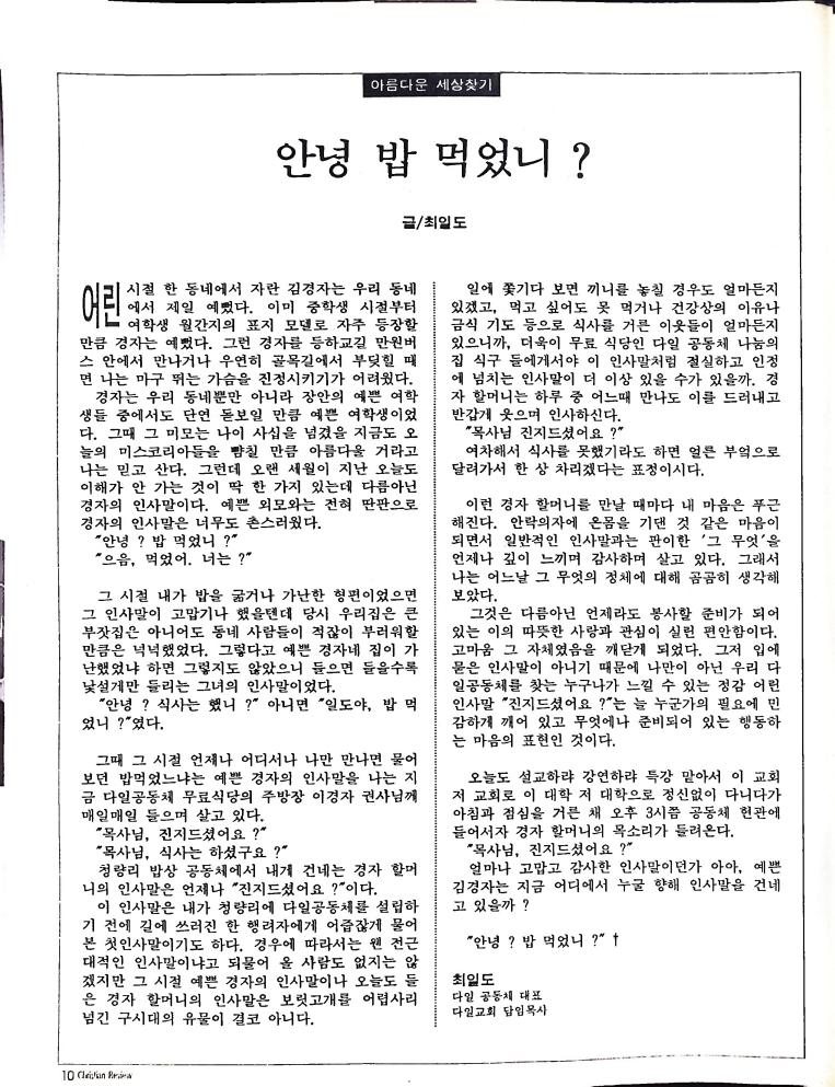 호주에서 1990년 1월부터 제작된 크리스찬 리뷰는 굳건한 신앙의 터전위에 교파를 초월한 신앙공동체로서 복음을 널리 전하기 위한 선교의 목적을 갖고 창간되었다. 생각해봅시다-1.5세들을 주목하십시오 / 목회서신-갈라서는 교회는 많은데 / 리뷰단상-포트엔젤스에서 만난 시련의 바람 / OMF사역과 태국선교