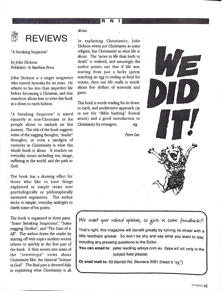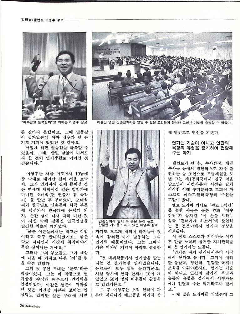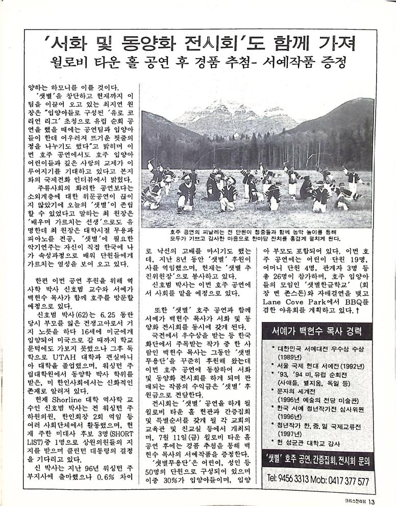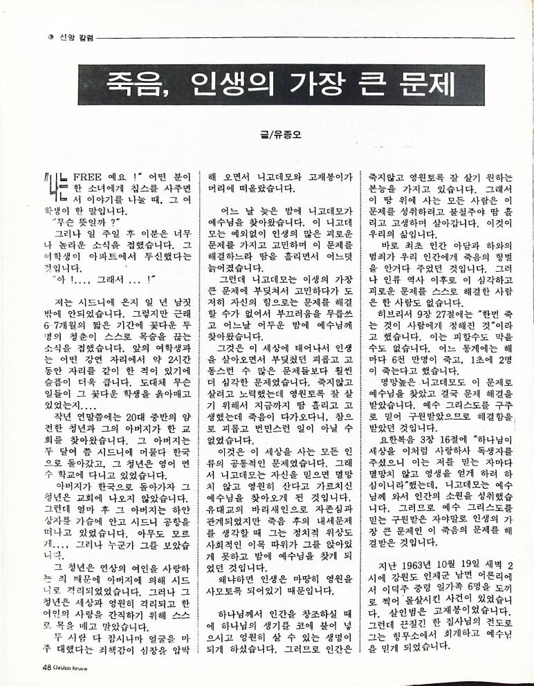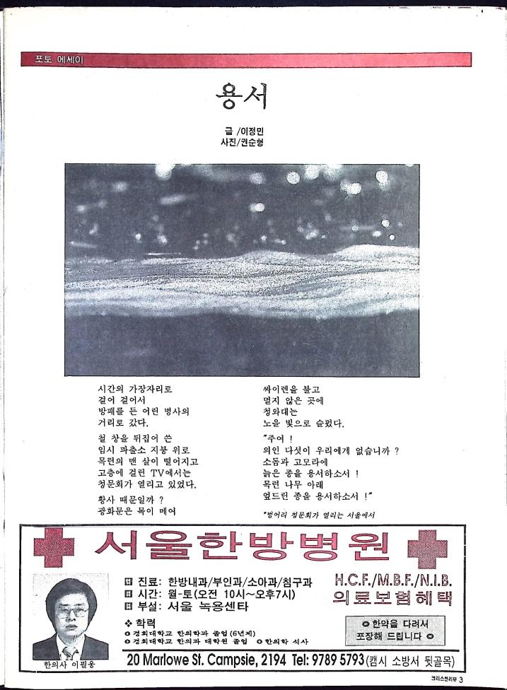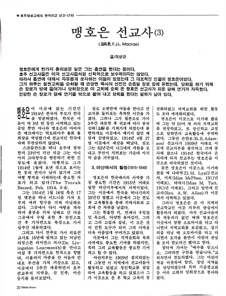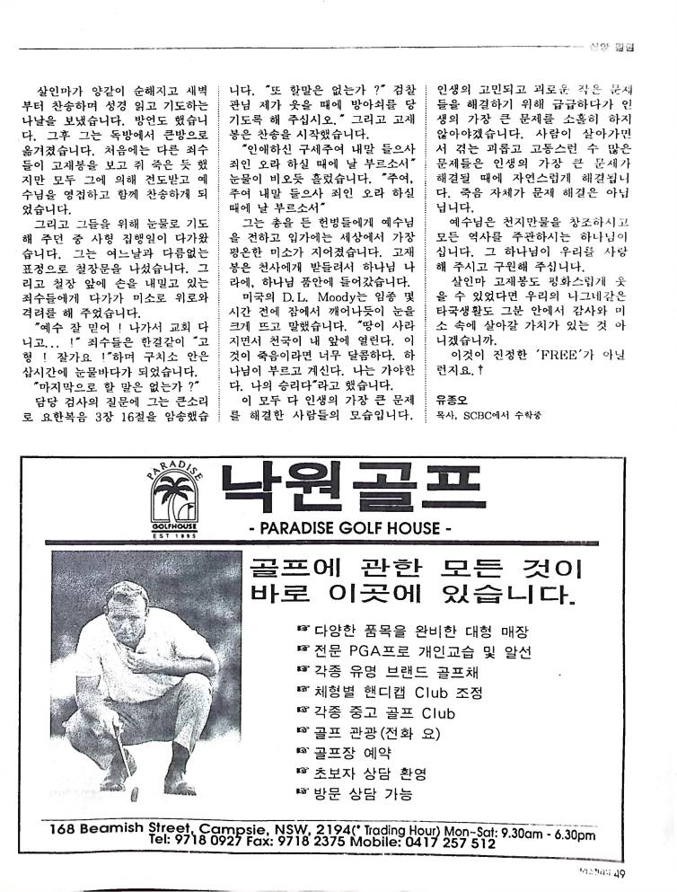 호주에서 1990년 1월부터 제작된 크리스찬 리뷰는 굳건한 신앙의 터전위에 교파를 초월한 신앙공동체로서 복음을 널리 전하기 위한 선교의 목적을 갖고 창간되었다. 생각해봅시다-1.5세들을 주목하십시오 / 목회서신-갈라서는 교회는 많은데 / 리뷰단상-포트엔젤스에서 만난 시련의 바람 / OMF사역과 태국선교