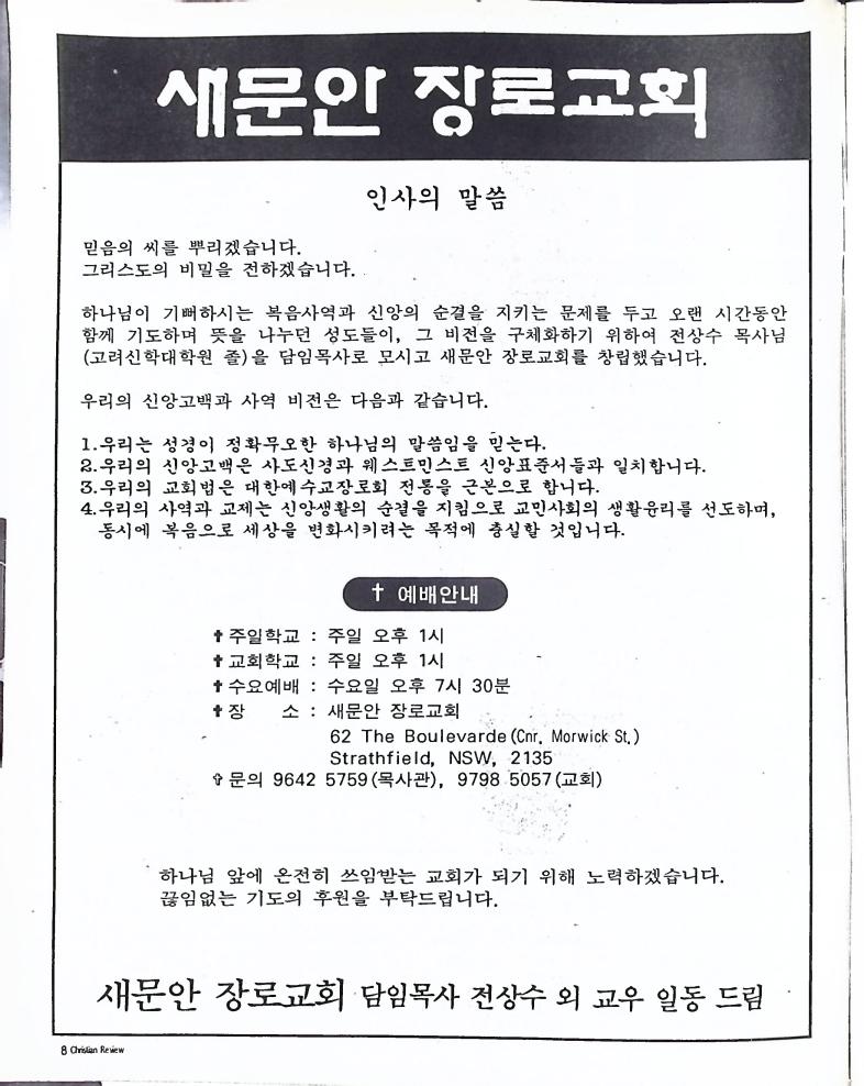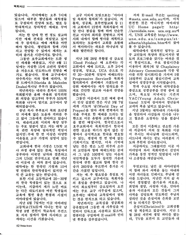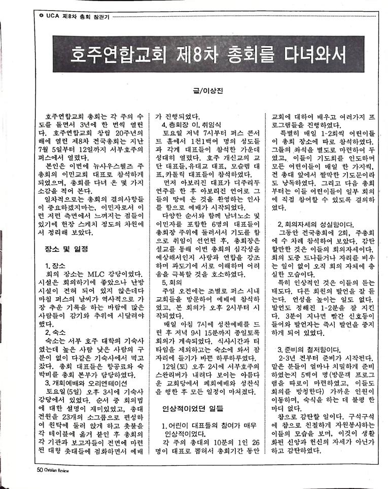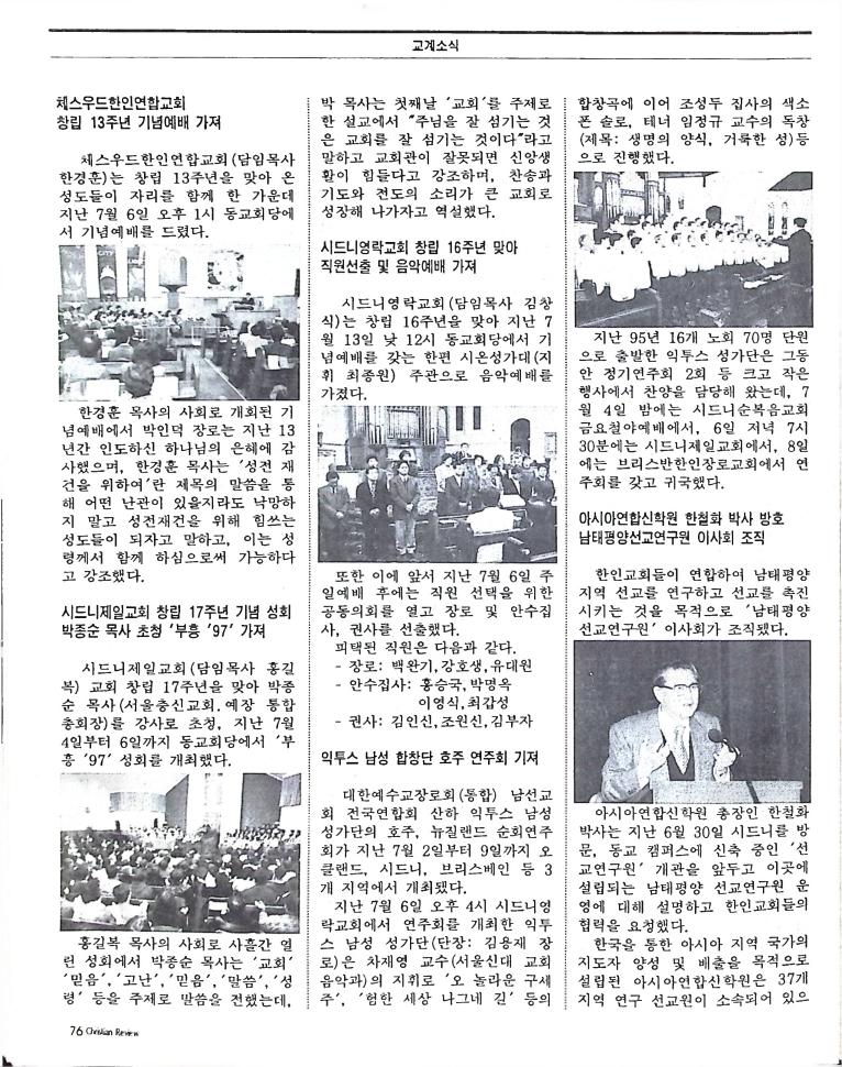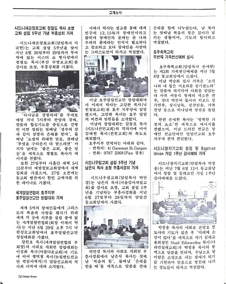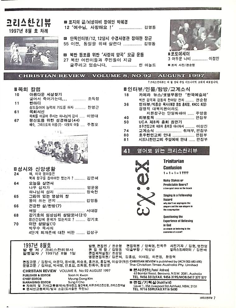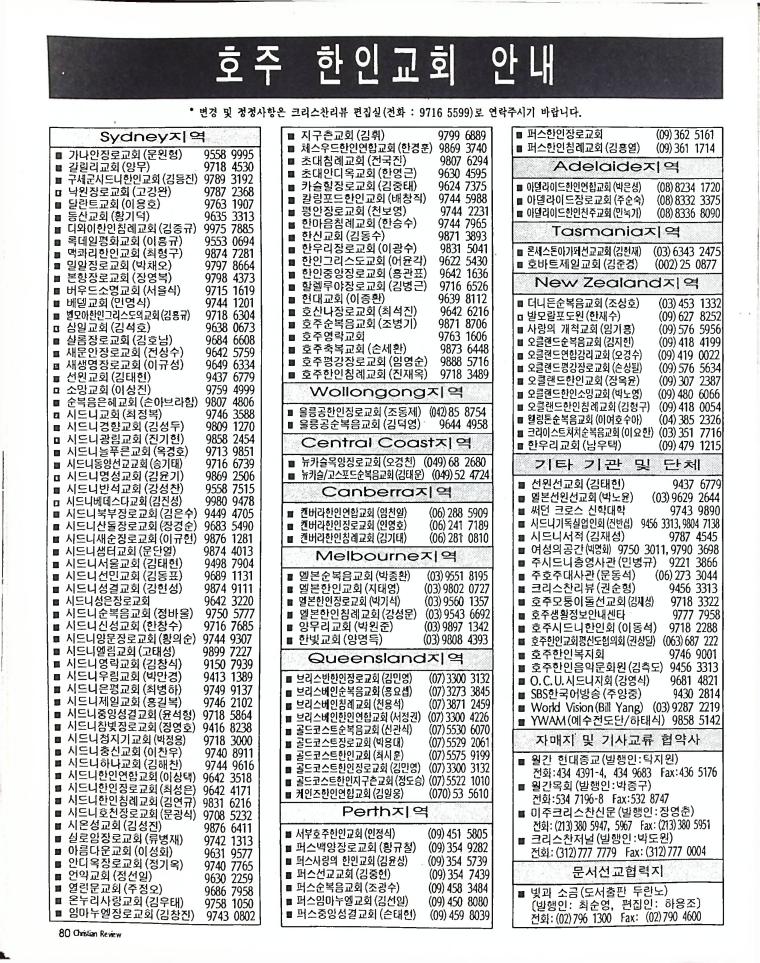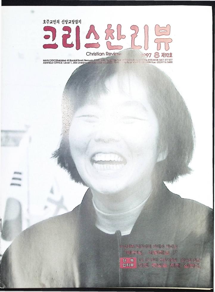 호주에서 1990년 1월부터 제작된 크리스찬 리뷰는 굳건한 신앙의 터전위에 교파를 초월한 신앙공동체로서 복음을 널리 전하기 위한 선교의 목적을 갖고 창간되었다. 아름다운 세상찾기-굶어서 죽어가는데... / 왜, 미국엄마들은 북과 장구를 잡아야만 했는가? / 북한 동포를 위한 '사랑의 양곡' 모금 운동 / UCA 제8차 총회 참관기