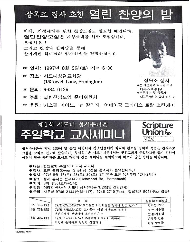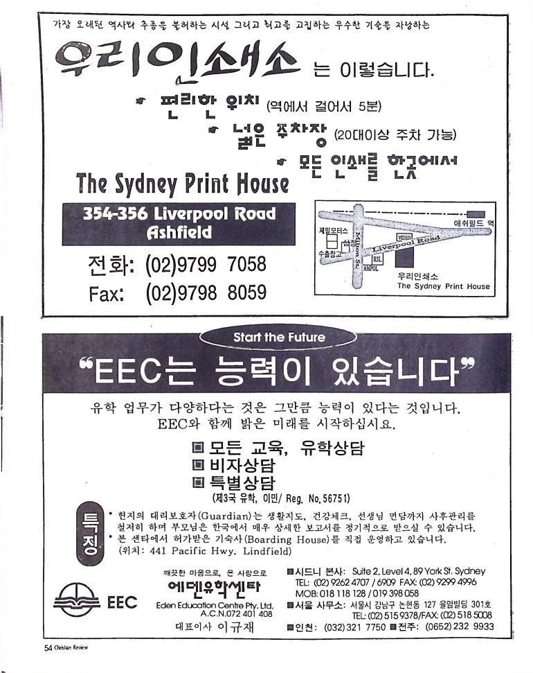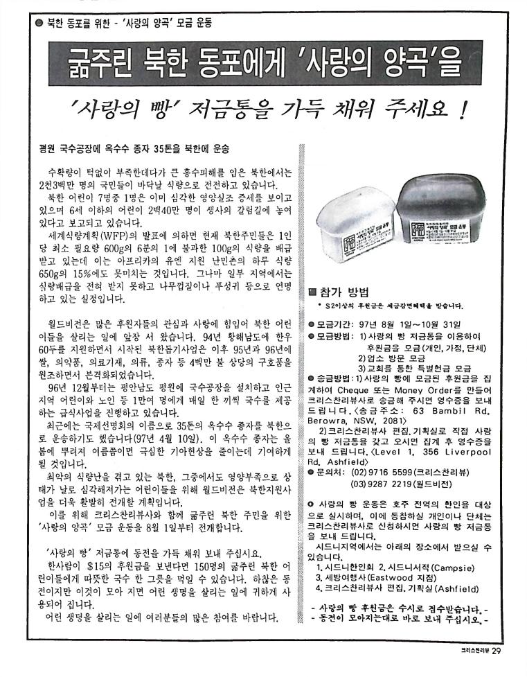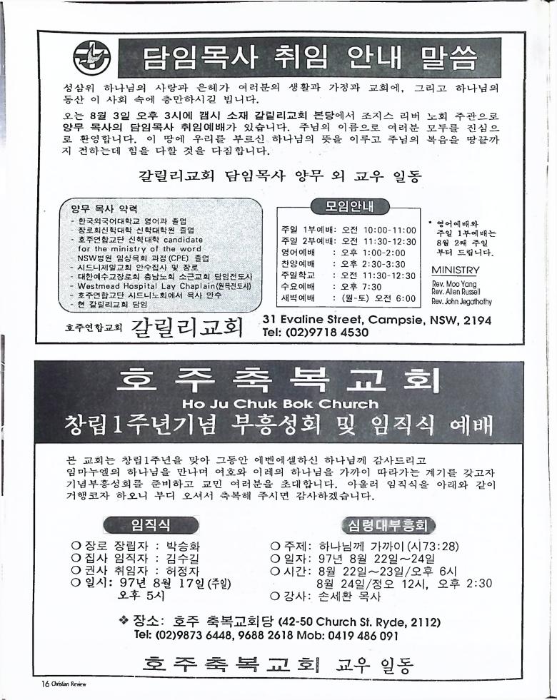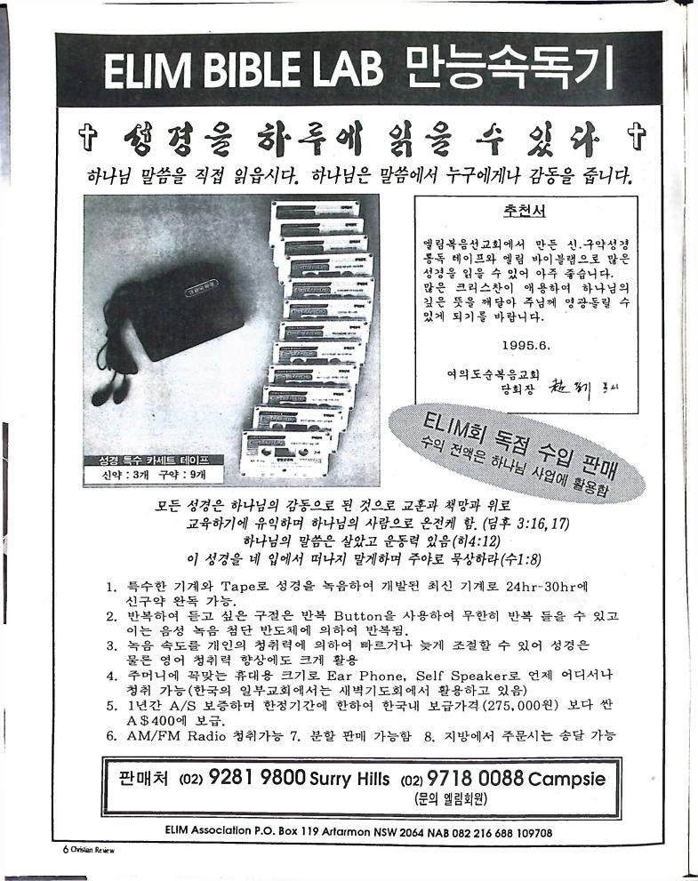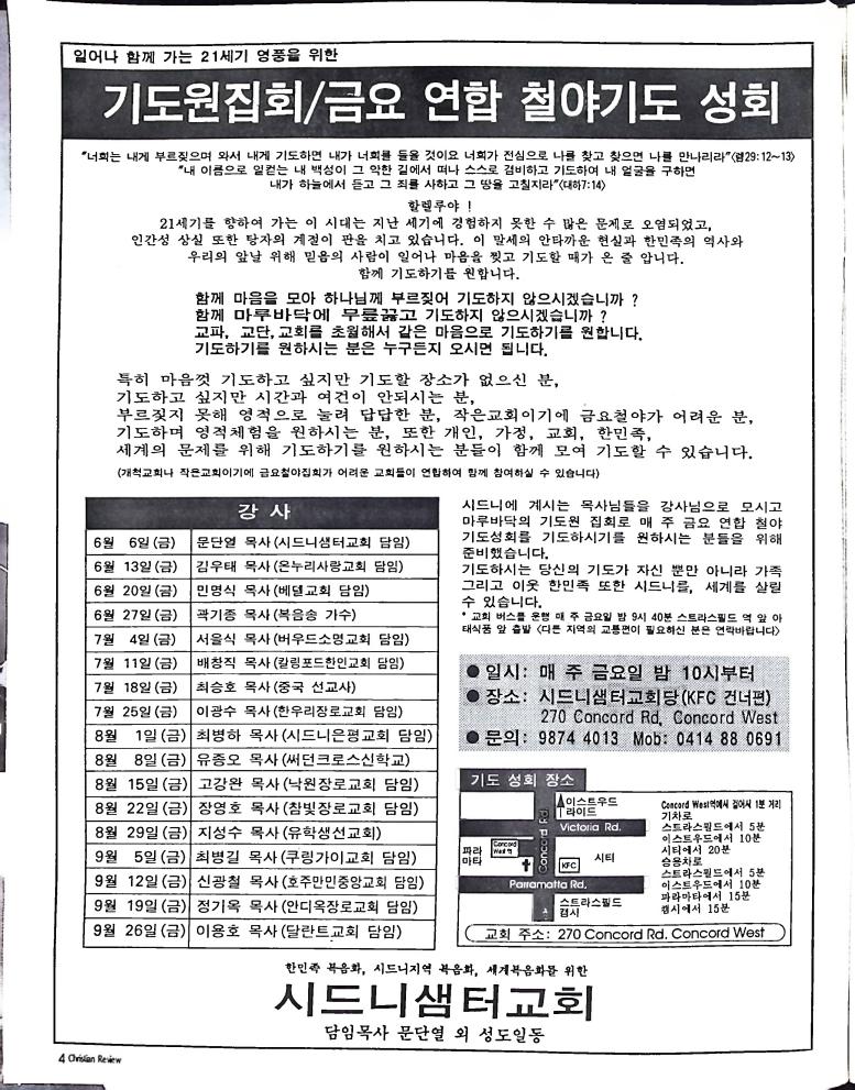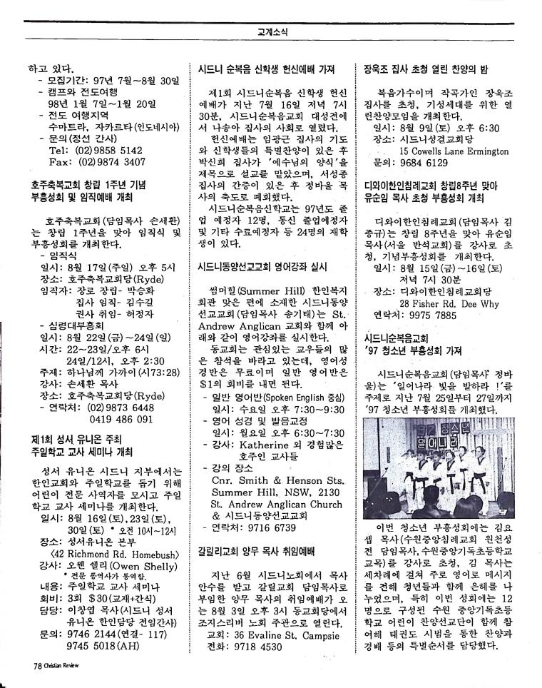 호주에서 1990년 1월부터 제작된 크리스찬 리뷰는 굳건한 신앙의 터전위에 교파를 초월한 신앙공동체로서 복음을 널리 전하기 위한 선교의 목적을 갖고 창간되었다. 아름다운 세상찾기-굶어서 죽어가는데... / 왜, 미국엄마들은 북과 장구를 잡아야만 했는가? / 북한 동포를 위한 '사랑의 양곡' 모금 운동 / UCA 제8차 총회 참관기