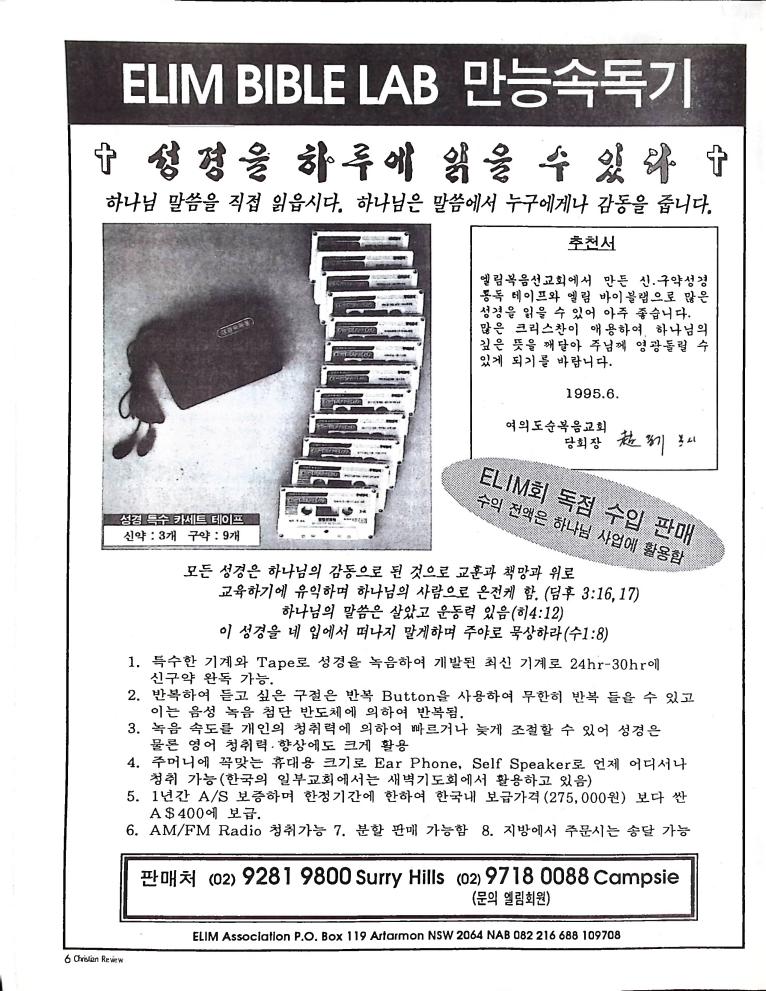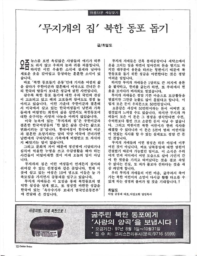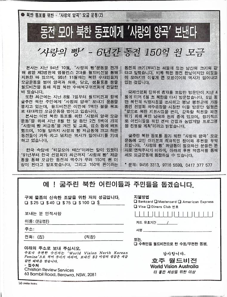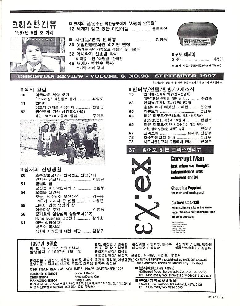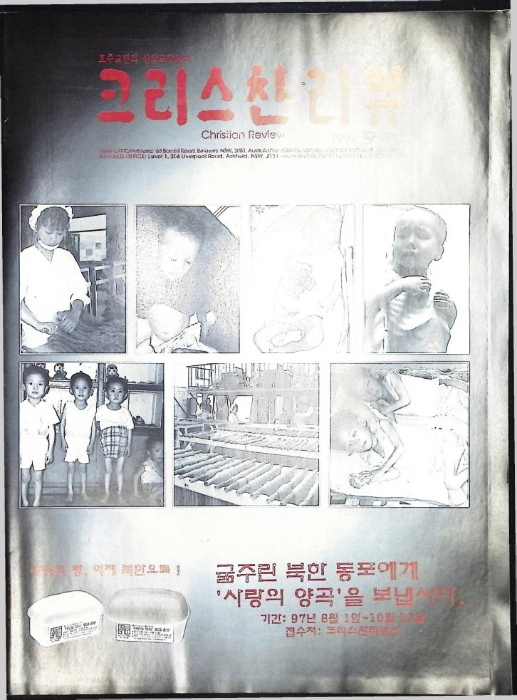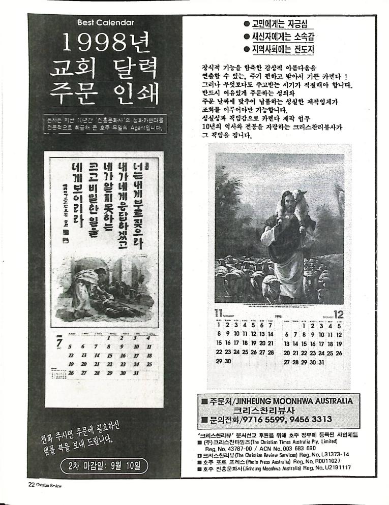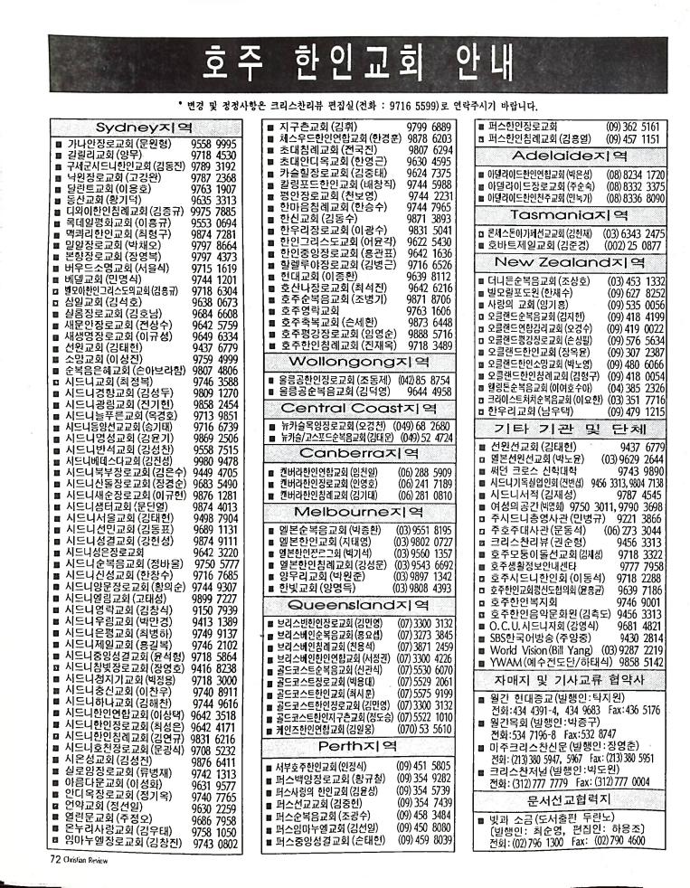 호주에서 1990년 1월부터 제작된 크리스찬 리뷰는 굳건한 신앙의 터전위에 교파를 초월한 신앙공동체로서 복음을 널리 전하기 위한 선교의 목적을 갖고 창간되었다. '무지개집' 북한동포 돕기 / 오늘을 살면서-오늘, 예수님이 오신다면 / 이단상담실 / 리뷰리포트-평신도협의회 제3차 정기총회