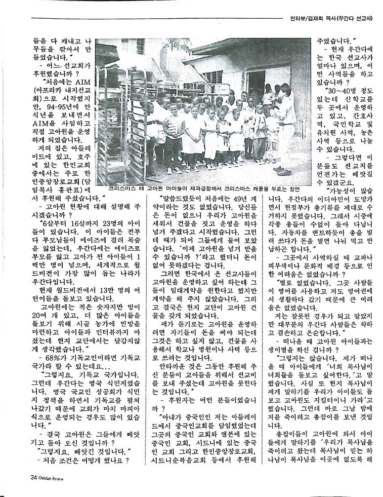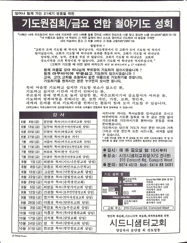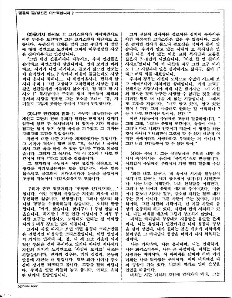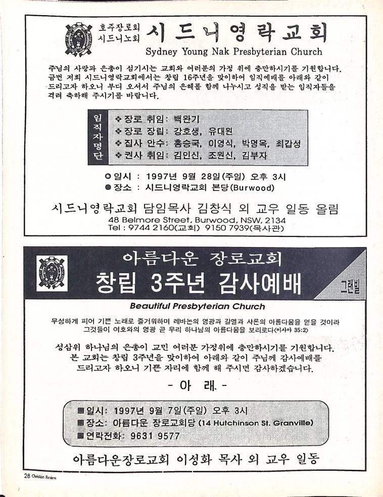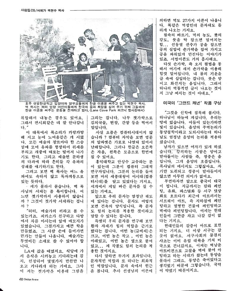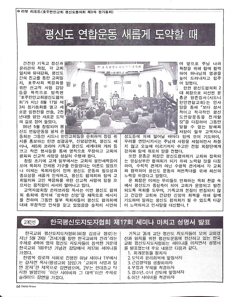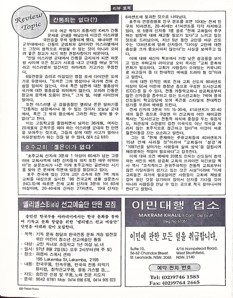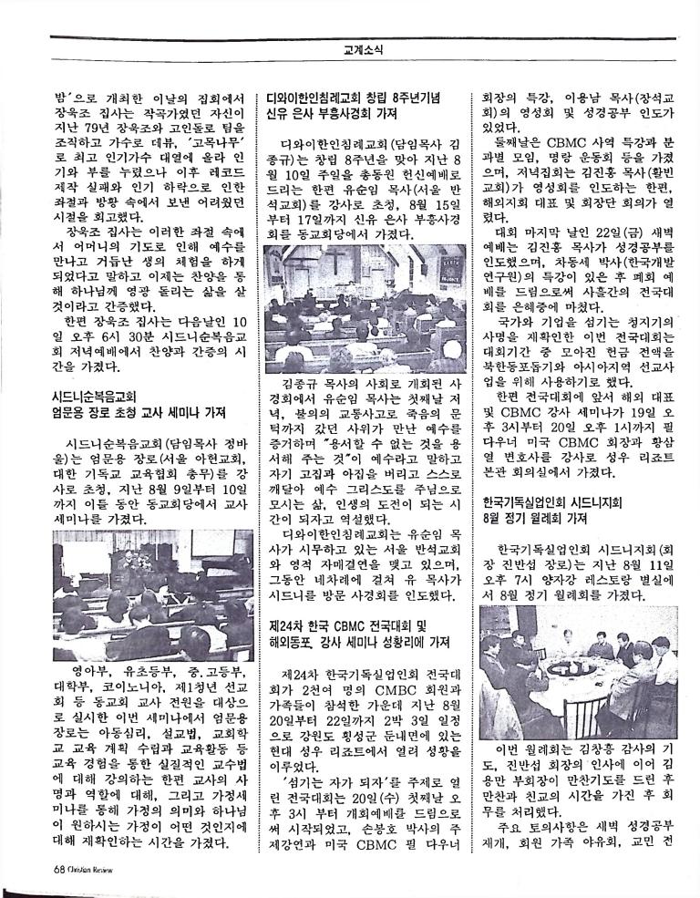 호주에서 1990년 1월부터 제작된 크리스찬 리뷰는 굳건한 신앙의 터전위에 교파를 초월한 신앙공동체로서 복음을 널리 전하기 위한 선교의 목적을 갖고 창간되었다. '무지개집' 북한동포 돕기 / 오늘을 살면서-오늘, 예수님이 오신다면 / 이단상담실 / 리뷰리포트-평신도협의회 제3차 정기총회