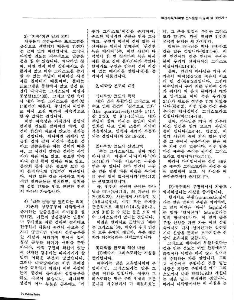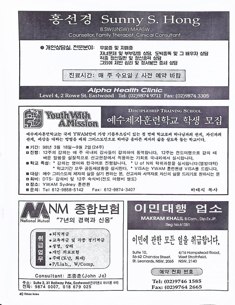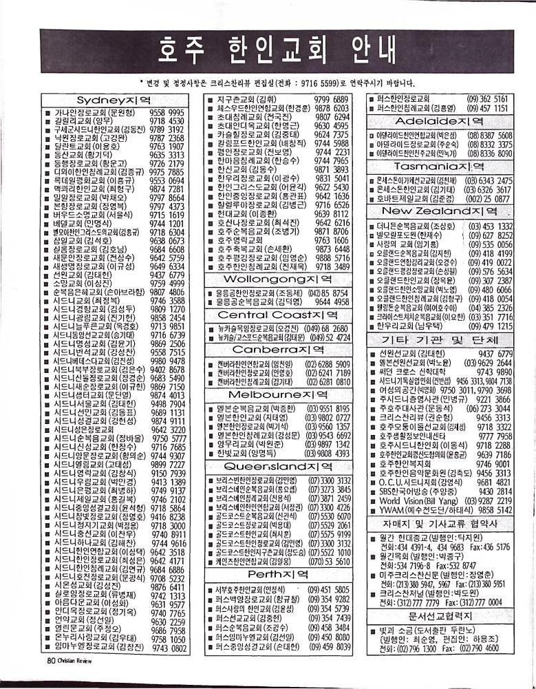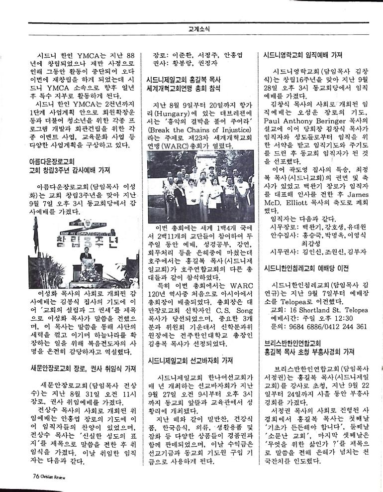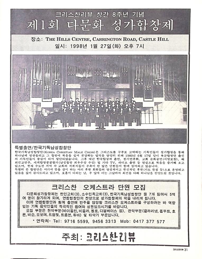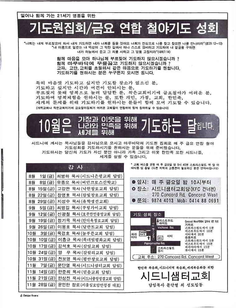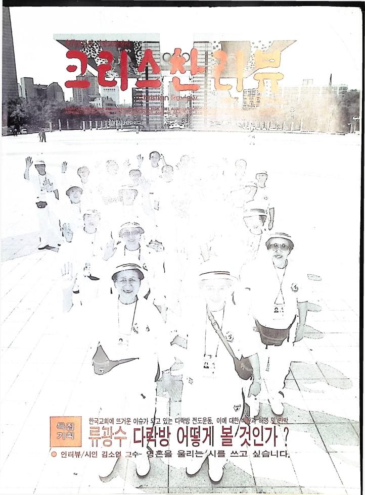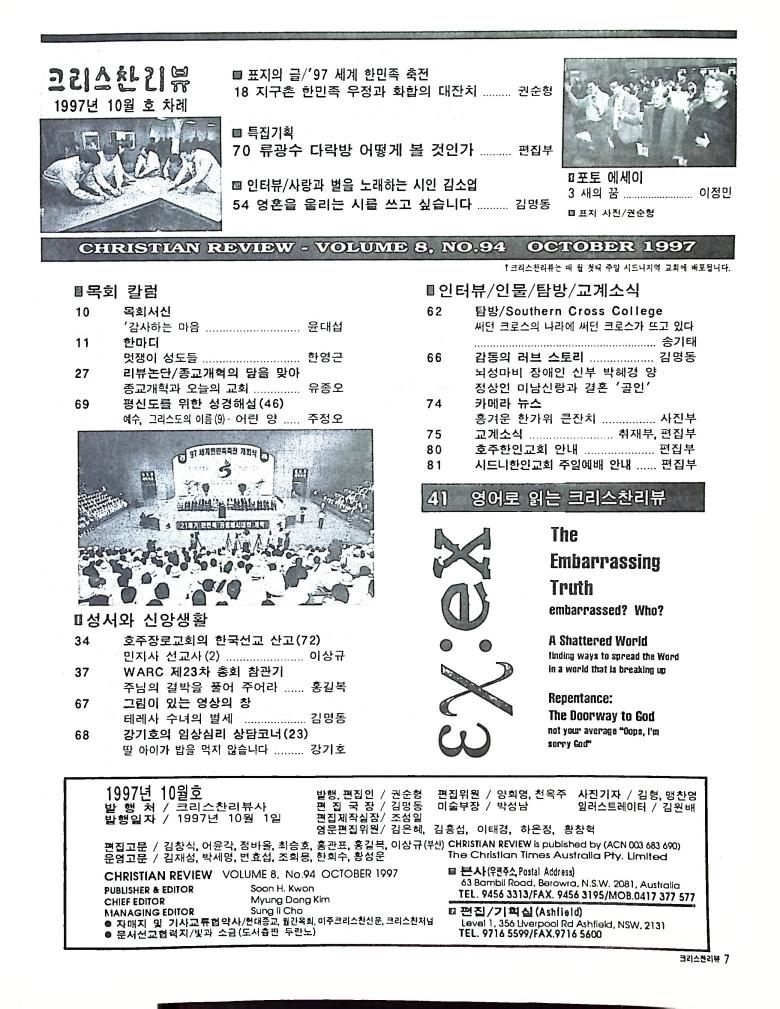 호주에서 1990년 1월부터 제작된 크리스찬 리뷰는 굳건한 신앙의 터전위에 교파를 초월한 신앙공동체로서 복음을 널리 전하기 위한 선교의 목적을 갖고 창간되었다. 리뷰논단-종교개혁의 달을 맞아 / WARC 제23차 총회 참관기 / 탐방-Southern Cross College / 류광수 다락방 어떻게 볼 것인가