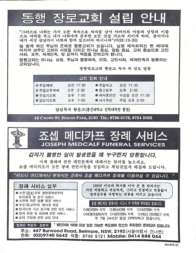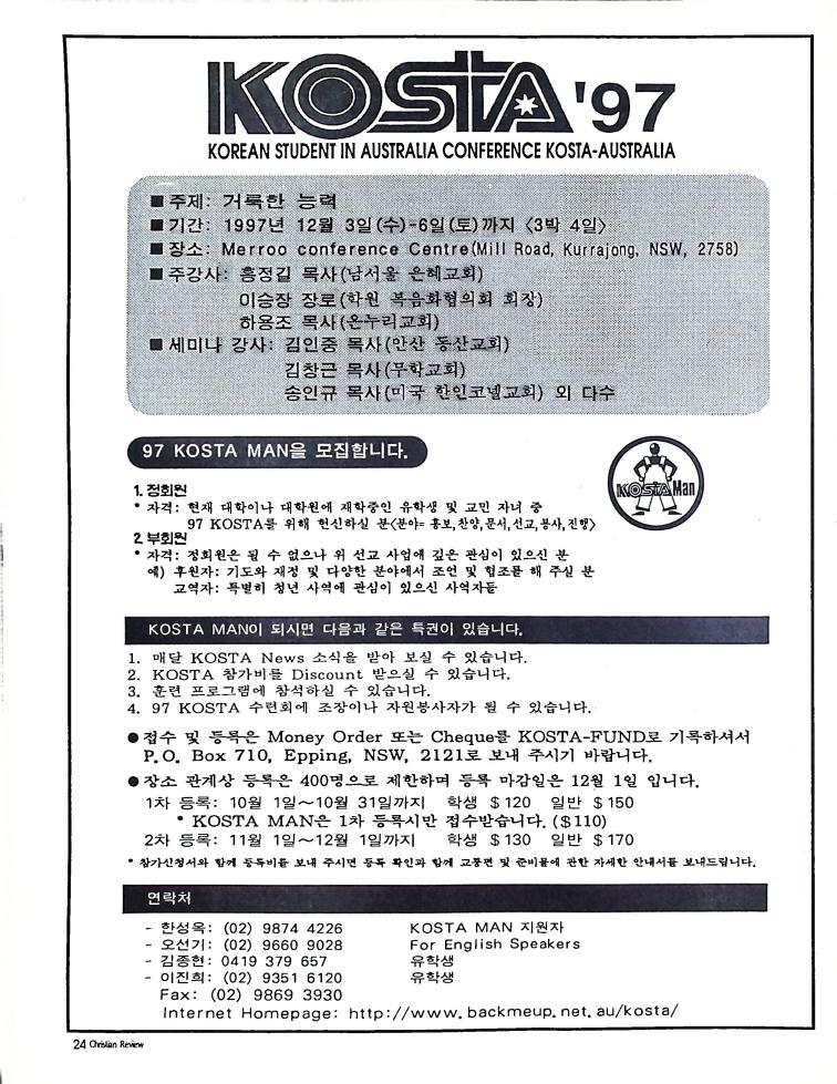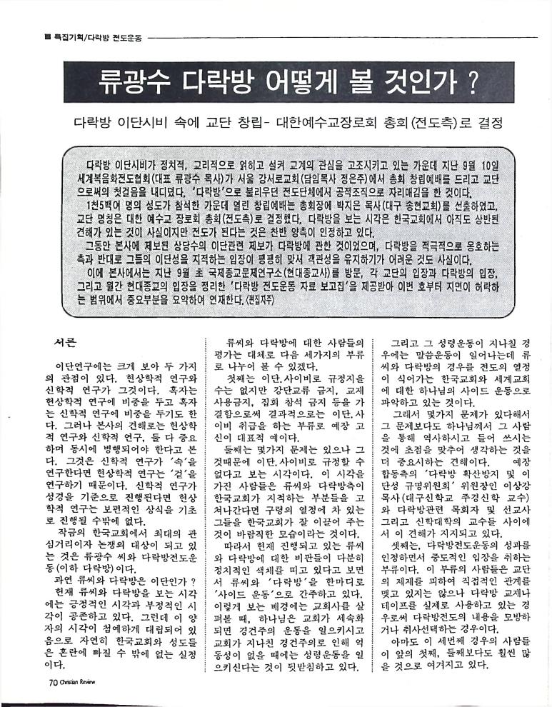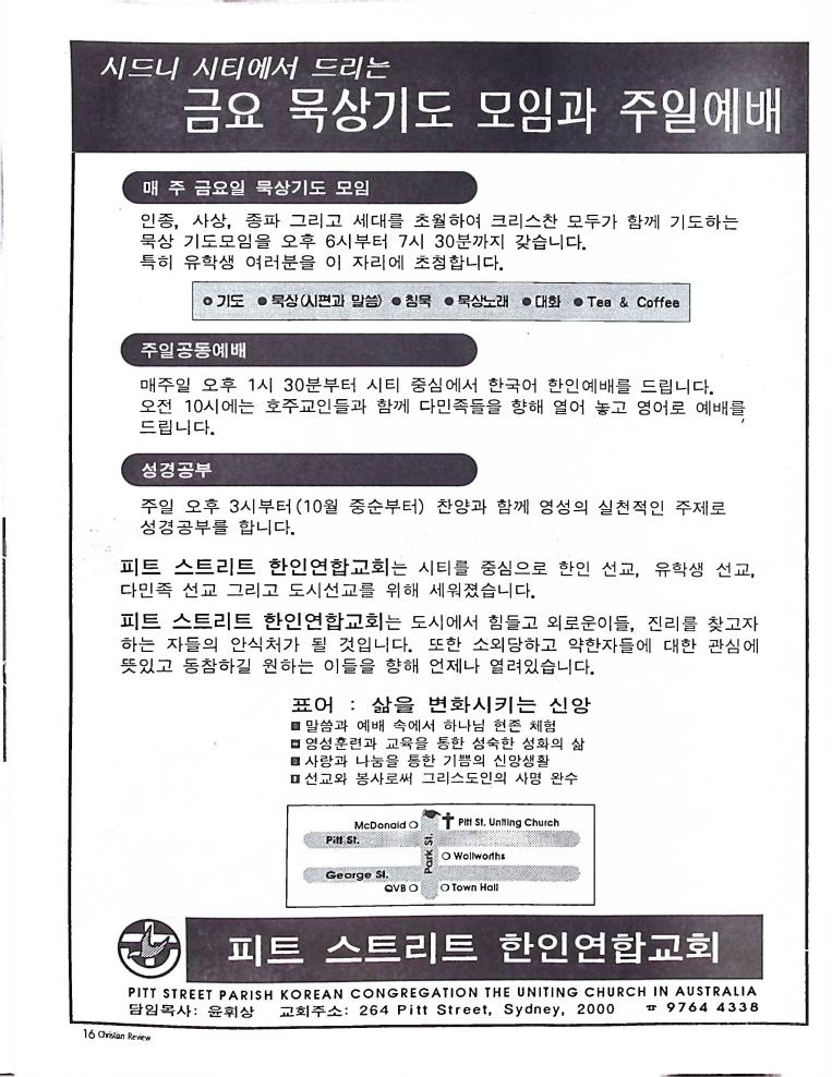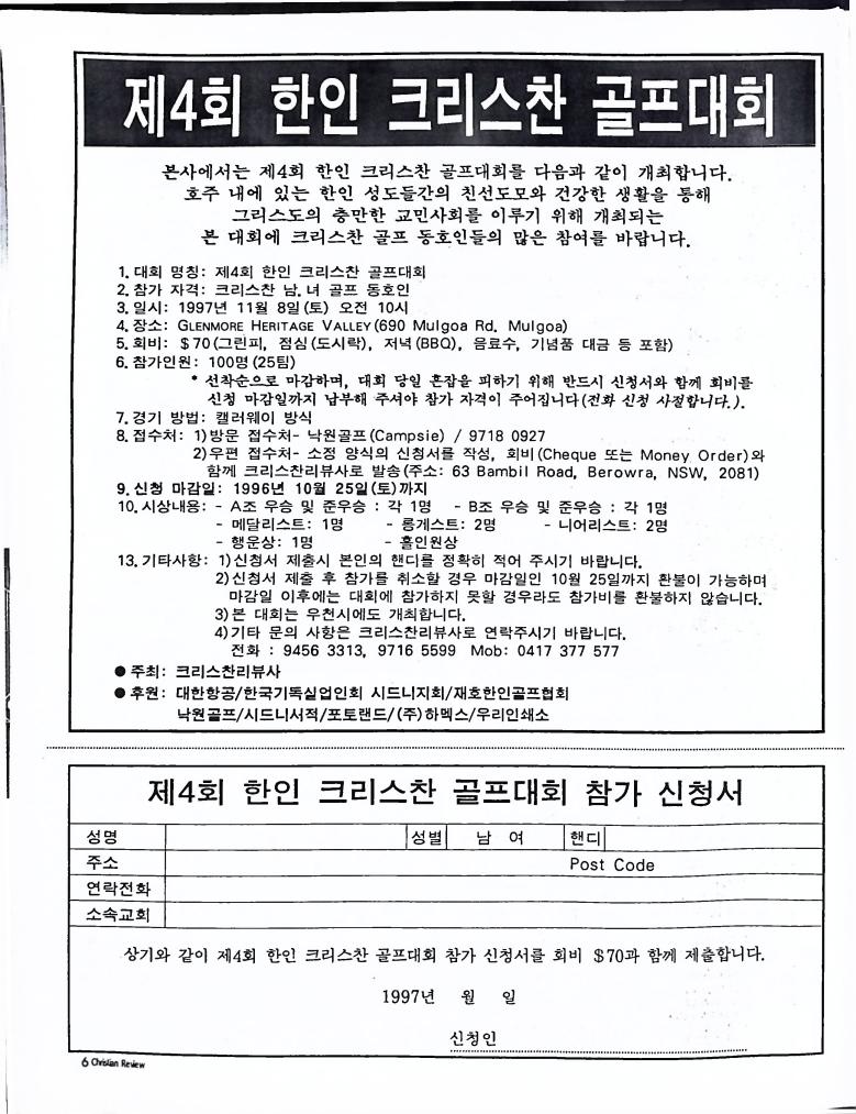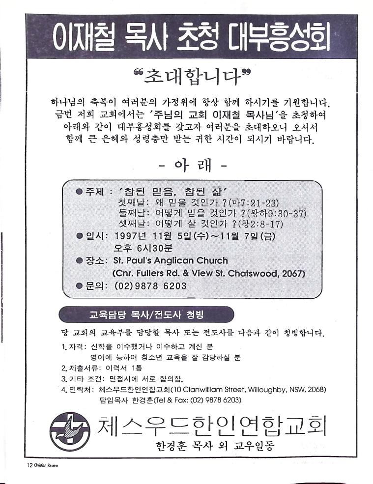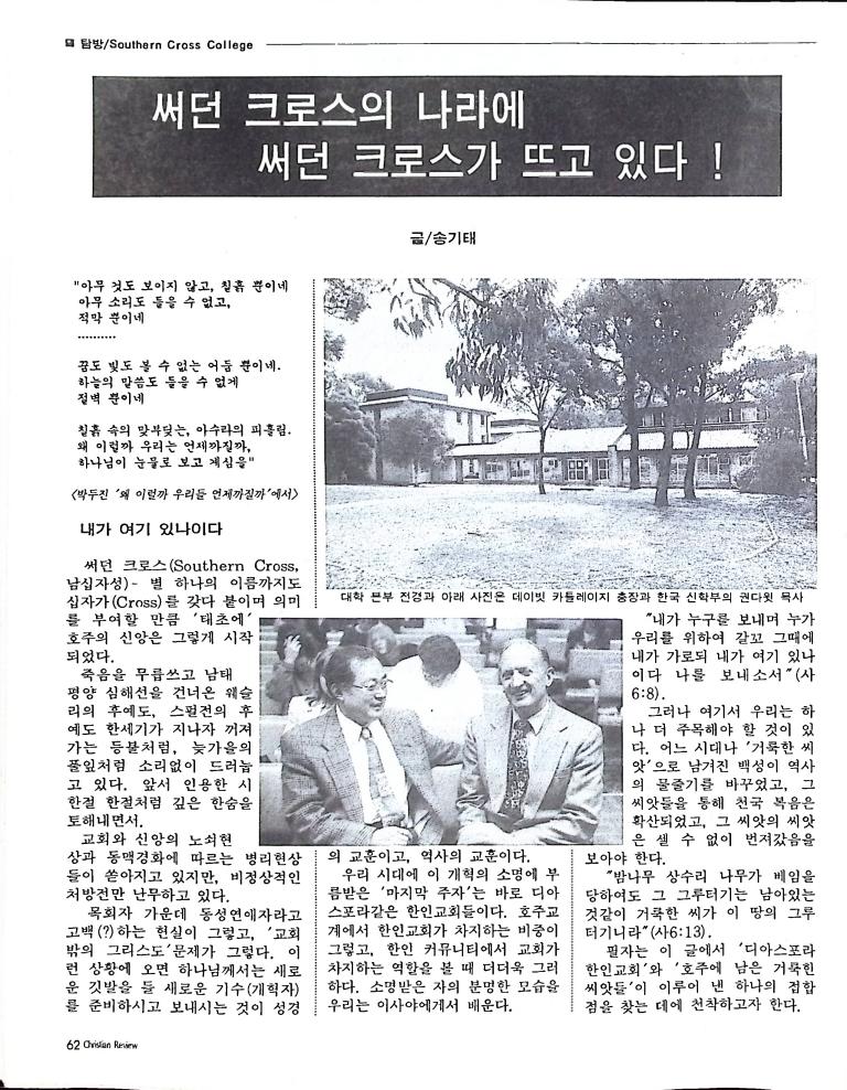 호주에서 1990년 1월부터 제작된 크리스찬 리뷰는 굳건한 신앙의 터전위에 교파를 초월한 신앙공동체로서 복음을 널리 전하기 위한 선교의 목적을 갖고 창간되었다. 리뷰논단-종교개혁의 달을 맞아 / WARC 제23차 총회 참관기 / 탐방-Southern Cross College / 류광수 다락방 어떻게 볼 것인가