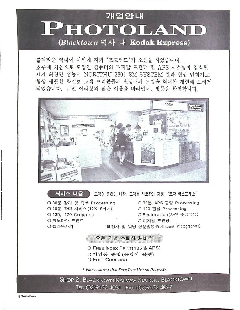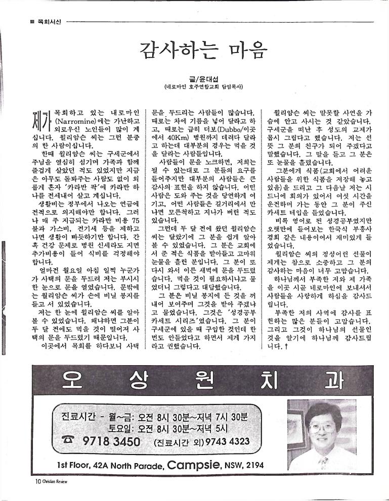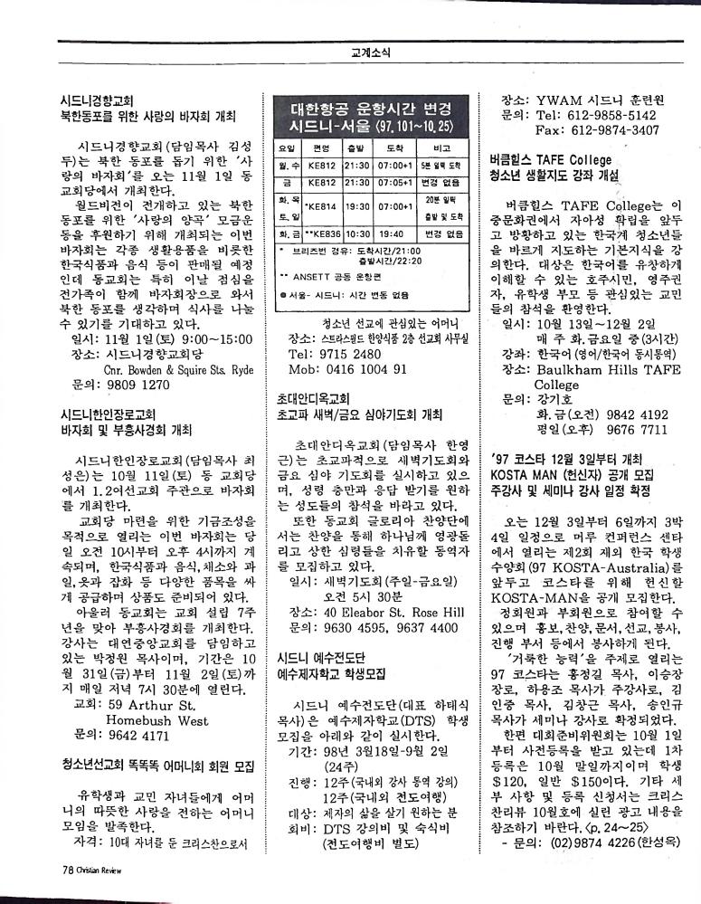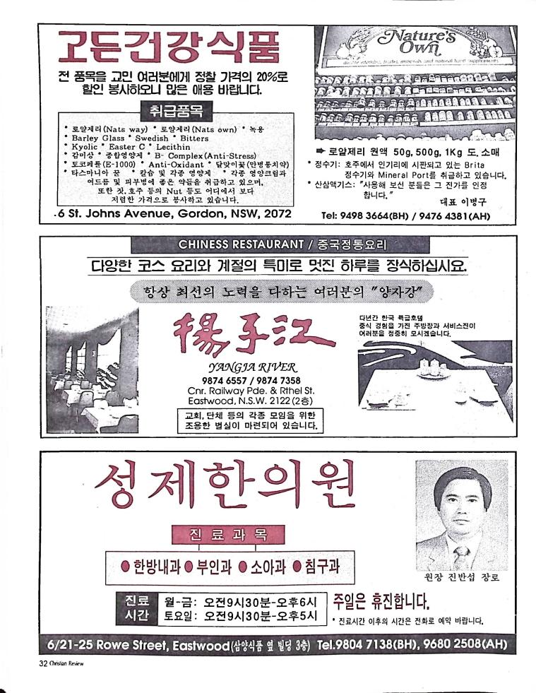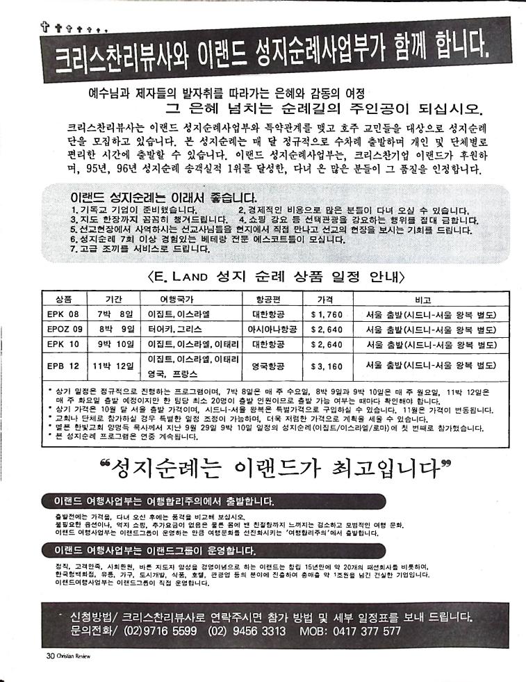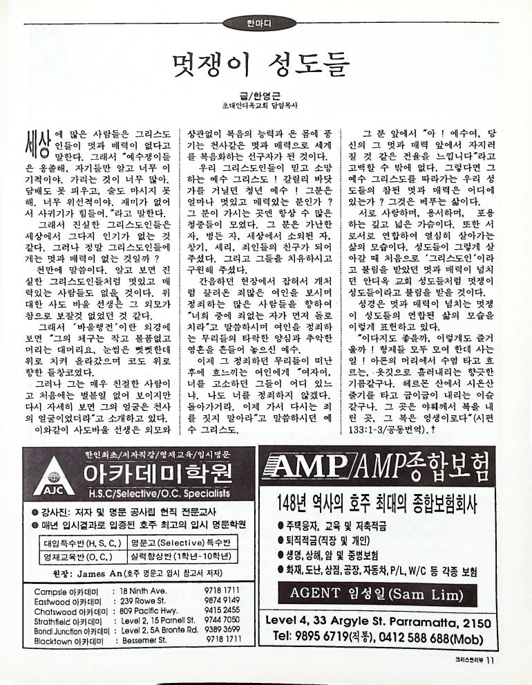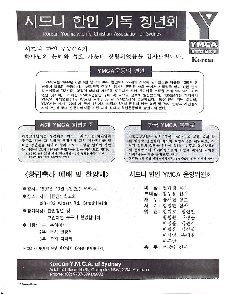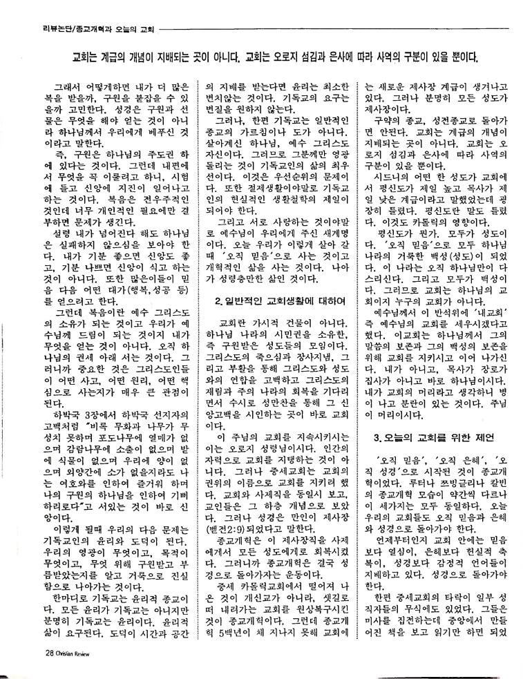 호주에서 1990년 1월부터 제작된 크리스찬 리뷰는 굳건한 신앙의 터전위에 교파를 초월한 신앙공동체로서 복음을 널리 전하기 위한 선교의 목적을 갖고 창간되었다. 리뷰논단-종교개혁의 달을 맞아 / WARC 제23차 총회 참관기 / 탐방-Southern Cross College / 류광수 다락방 어떻게 볼 것인가