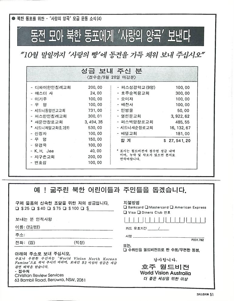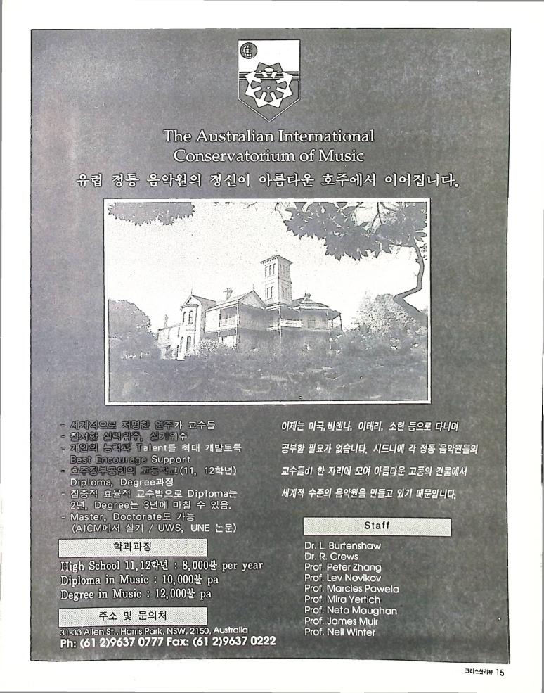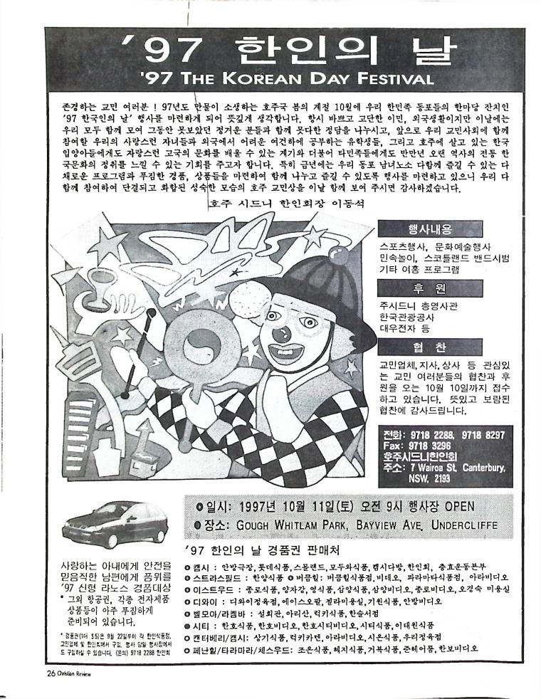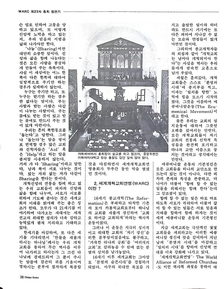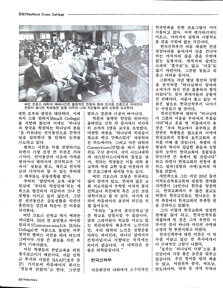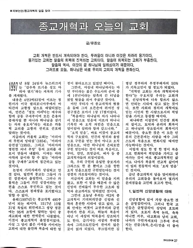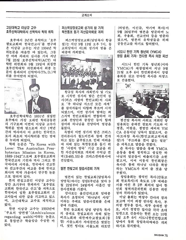 호주에서 1990년 1월부터 제작된 크리스찬 리뷰는 굳건한 신앙의 터전위에 교파를 초월한 신앙공동체로서 복음을 널리 전하기 위한 선교의 목적을 갖고 창간되었다. 리뷰논단-종교개혁의 달을 맞아 / WARC 제23차 총회 참관기 / 탐방-Southern Cross College / 류광수 다락방 어떻게 볼 것인가