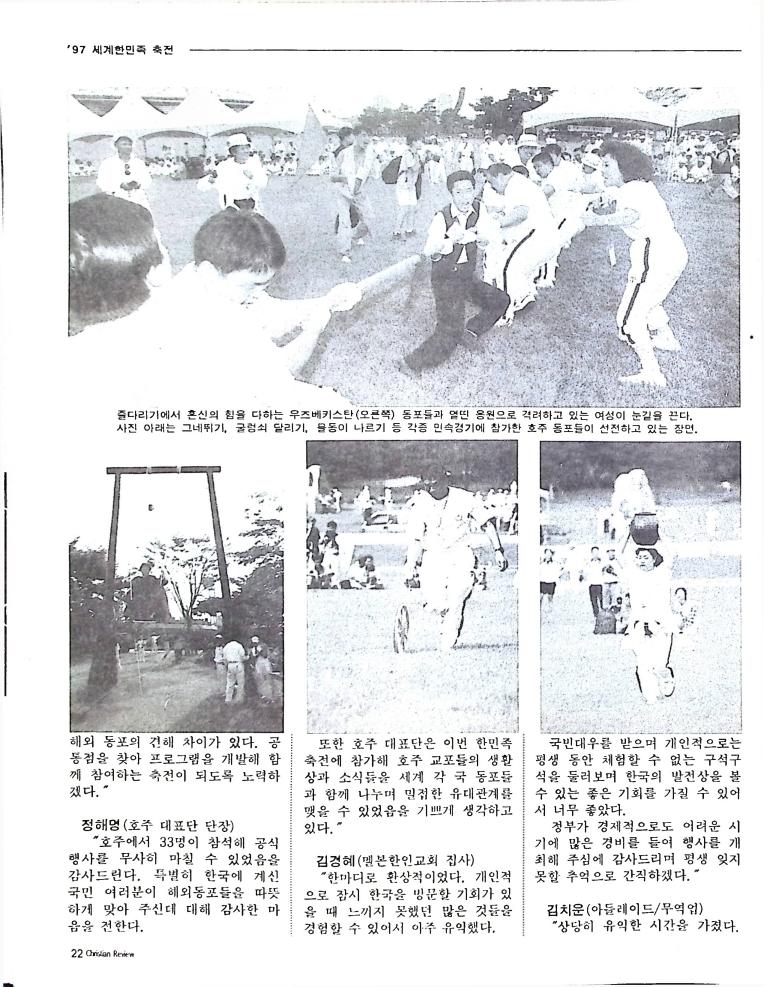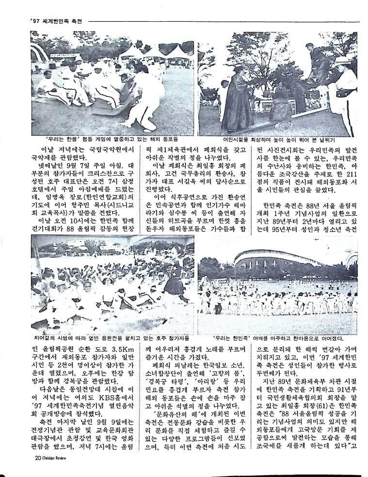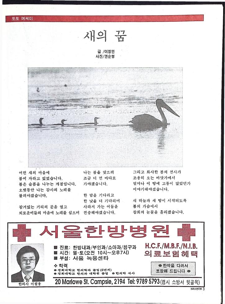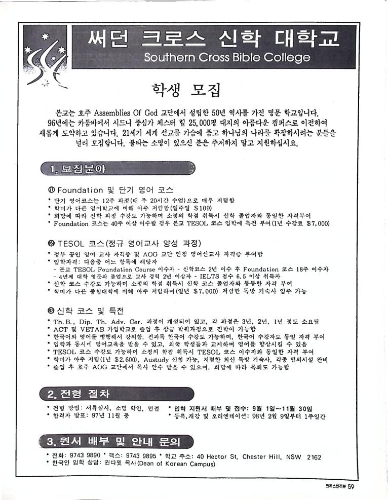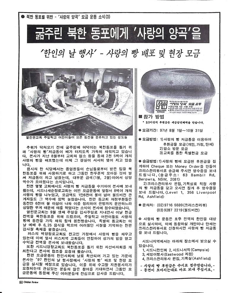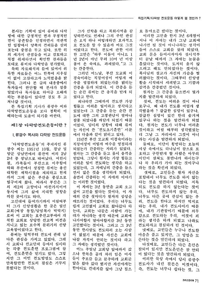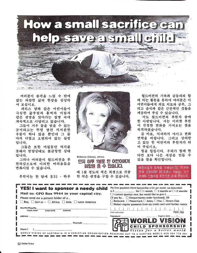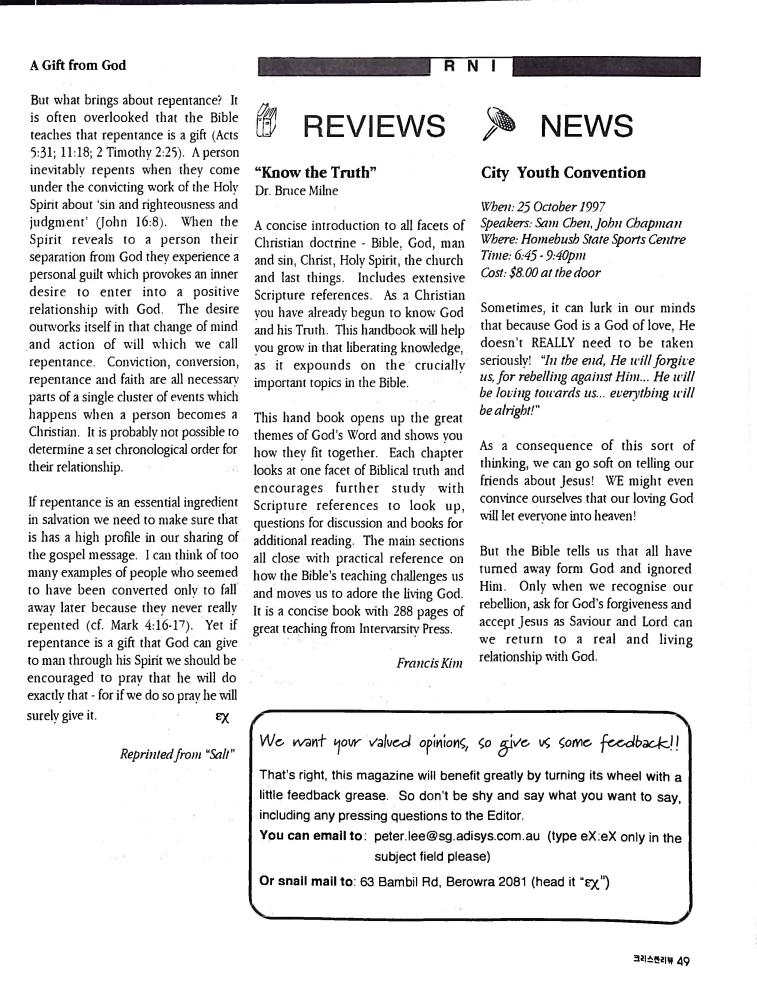 호주에서 1990년 1월부터 제작된 크리스찬 리뷰는 굳건한 신앙의 터전위에 교파를 초월한 신앙공동체로서 복음을 널리 전하기 위한 선교의 목적을 갖고 창간되었다. 리뷰논단-종교개혁의 달을 맞아 / WARC 제23차 총회 참관기 / 탐방-Southern Cross College / 류광수 다락방 어떻게 볼 것인가