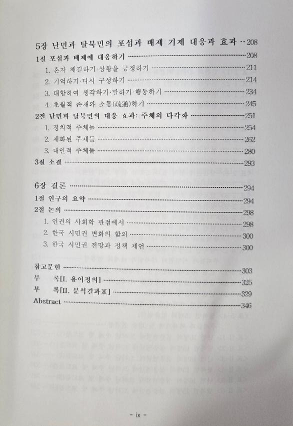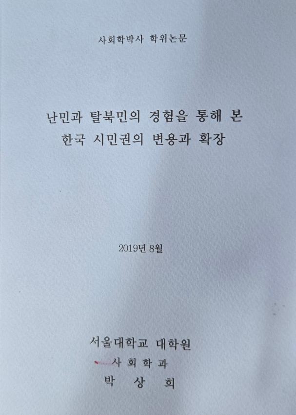 2019년 서울대학교 대학원 사회학과 박사 학위논문으로 21세기의 난민을 강제이재민(forced displaced perpons)으로 간주하여 난민과 탈북민을 함께 연구함으로써 난민개념의 구시대성 협소함을 넒히고자 했으며 난민연구에서 특수한 사례인 한국을 한국의 맥락 속에서 난민과 탈북민이 배제되는 원인을 탐구하고 있다