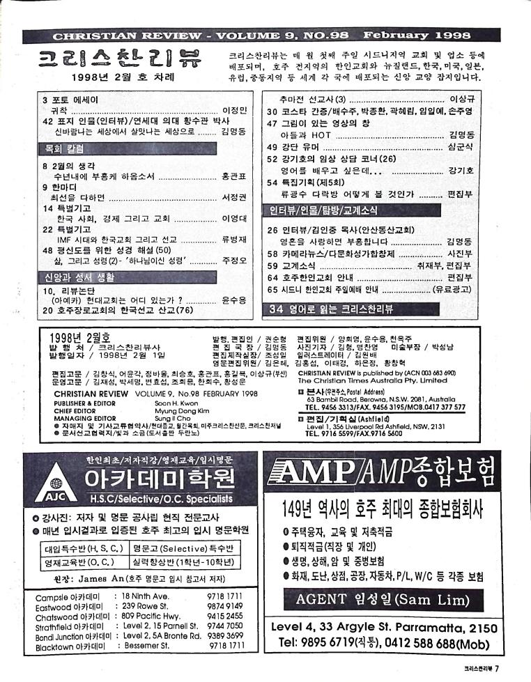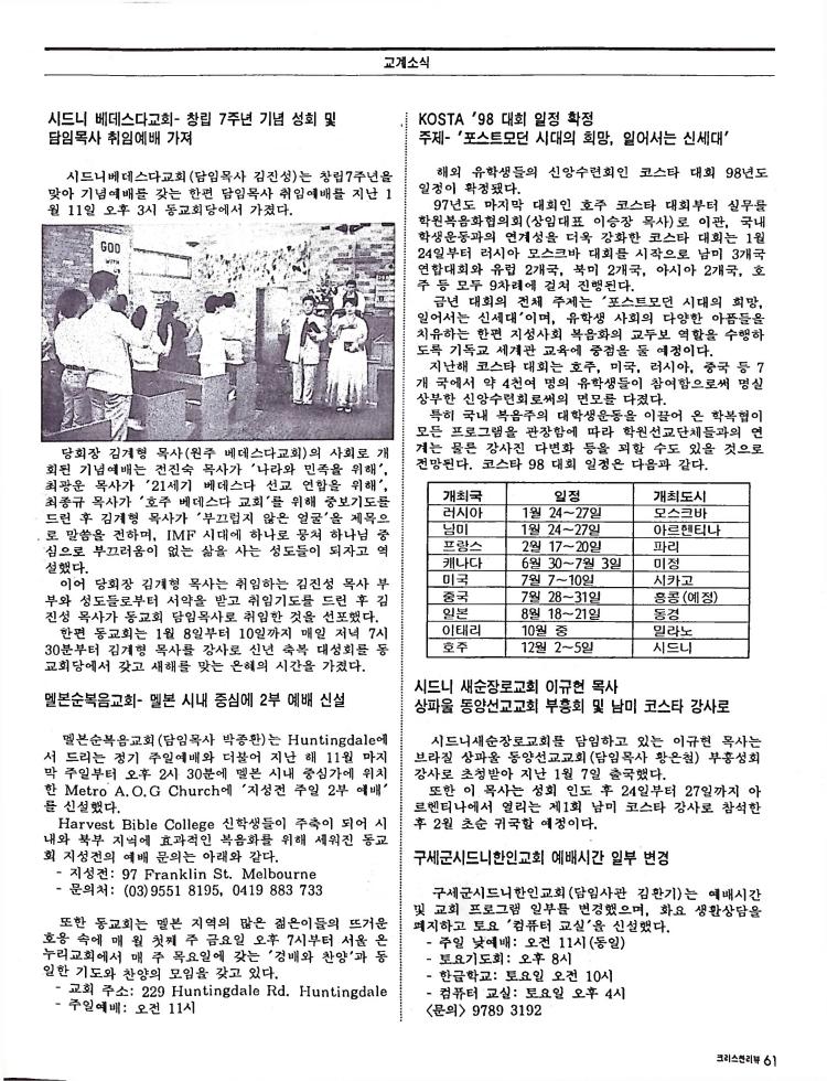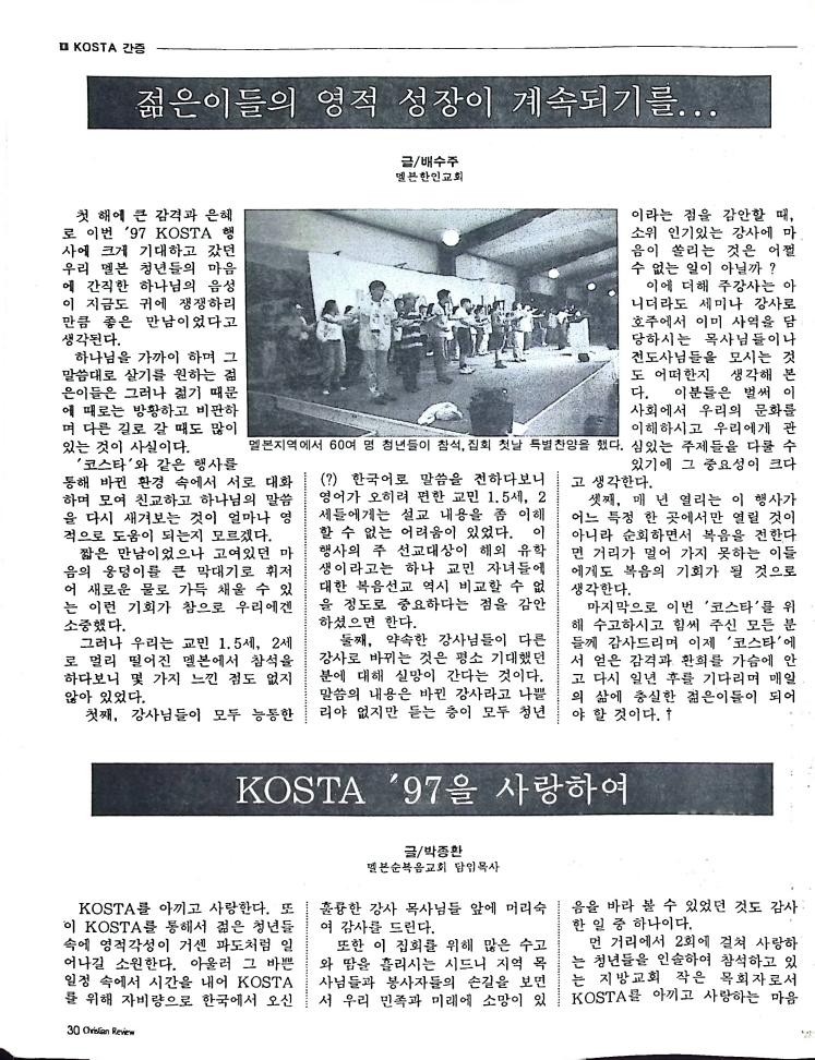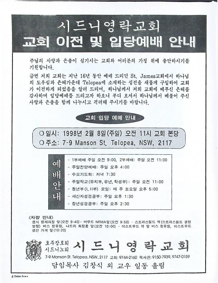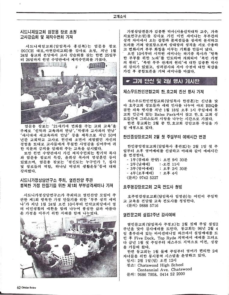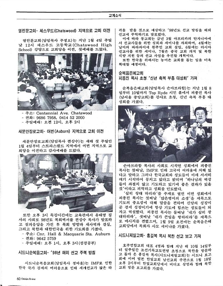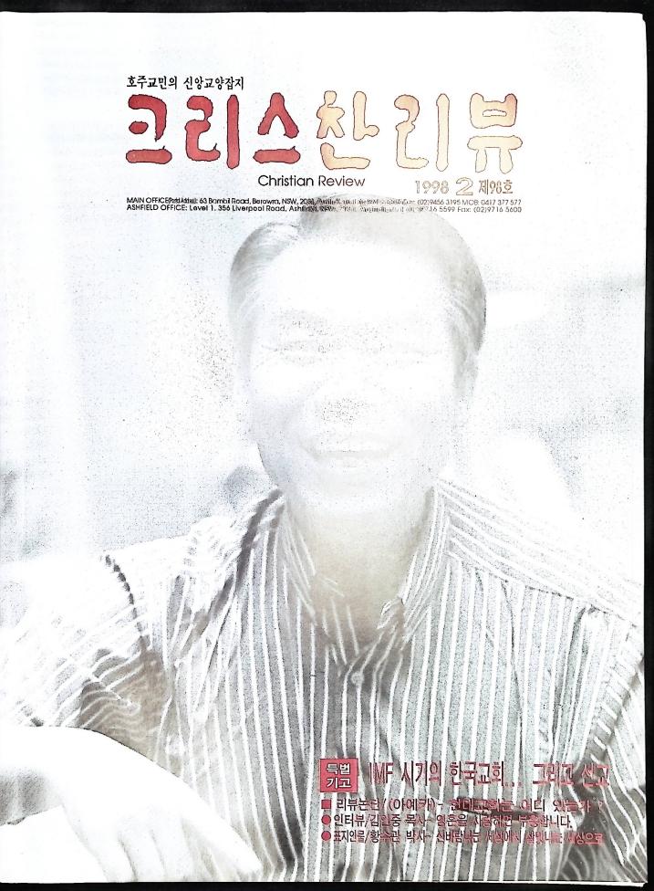호주에서 1990년 1월부터 제작된 크리스찬 리뷰는 굳건한 신앙의 터전위에 교파를 초월한 신앙공동체로서 복음을 널리 전하기 위한 선교의 목적을 갖고 창간되었다. 특별기고-한국사회, 경제 그리고 교회 / 특별기고-IMF 시대와 한국교회 그리고 선교 / 리뷰논단-현대교회는 어디 있는가? / 카메라뉴스-다문화성가합창제